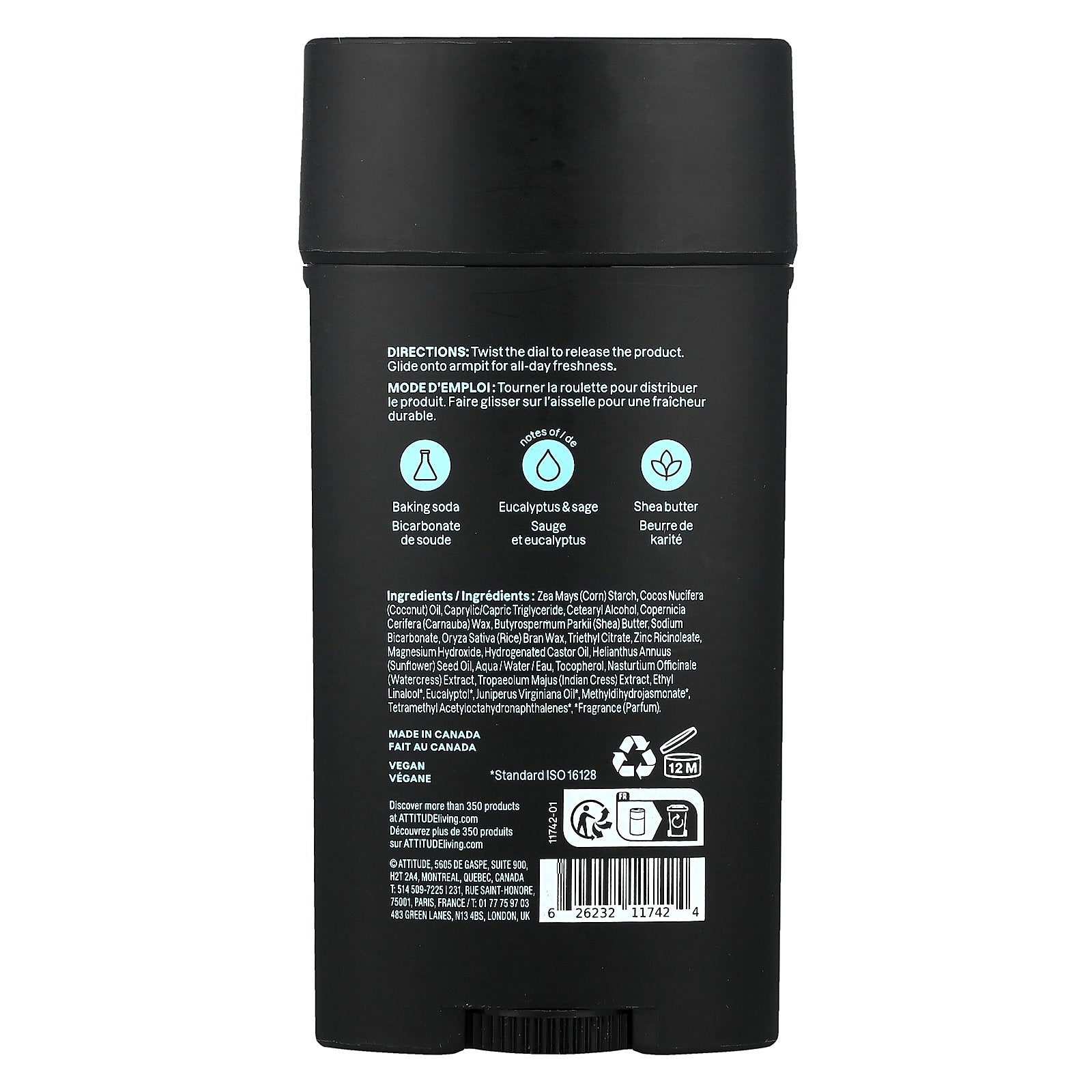 Zea mays (corn) starch, cocos nucifera (coconut) oil, caprylic/capric triglyceride, cetearyl alcohol, copernicia cerifera (carnauba) wax, butyrospermum parkii (shea) butter, sodium bicarbonate, oryza sativa (rice) bran wax, triethyl citrate, zinc ricinoleate, magnesium hydroxide, hydrogenated castor oil, helianthus annuus (sunflower) seed oil, aqua/water/eau, tocopherol, nasturtium officinale (watercress) extract, tropaeolum majus (indian cress) extract, ethyl linalool*, eucalyptol*, juniperus virginiana oil*, methyldihydrojasmonate*, tetramethyl acetyloctahydronaphthalenes*, *fragrance (parfum).