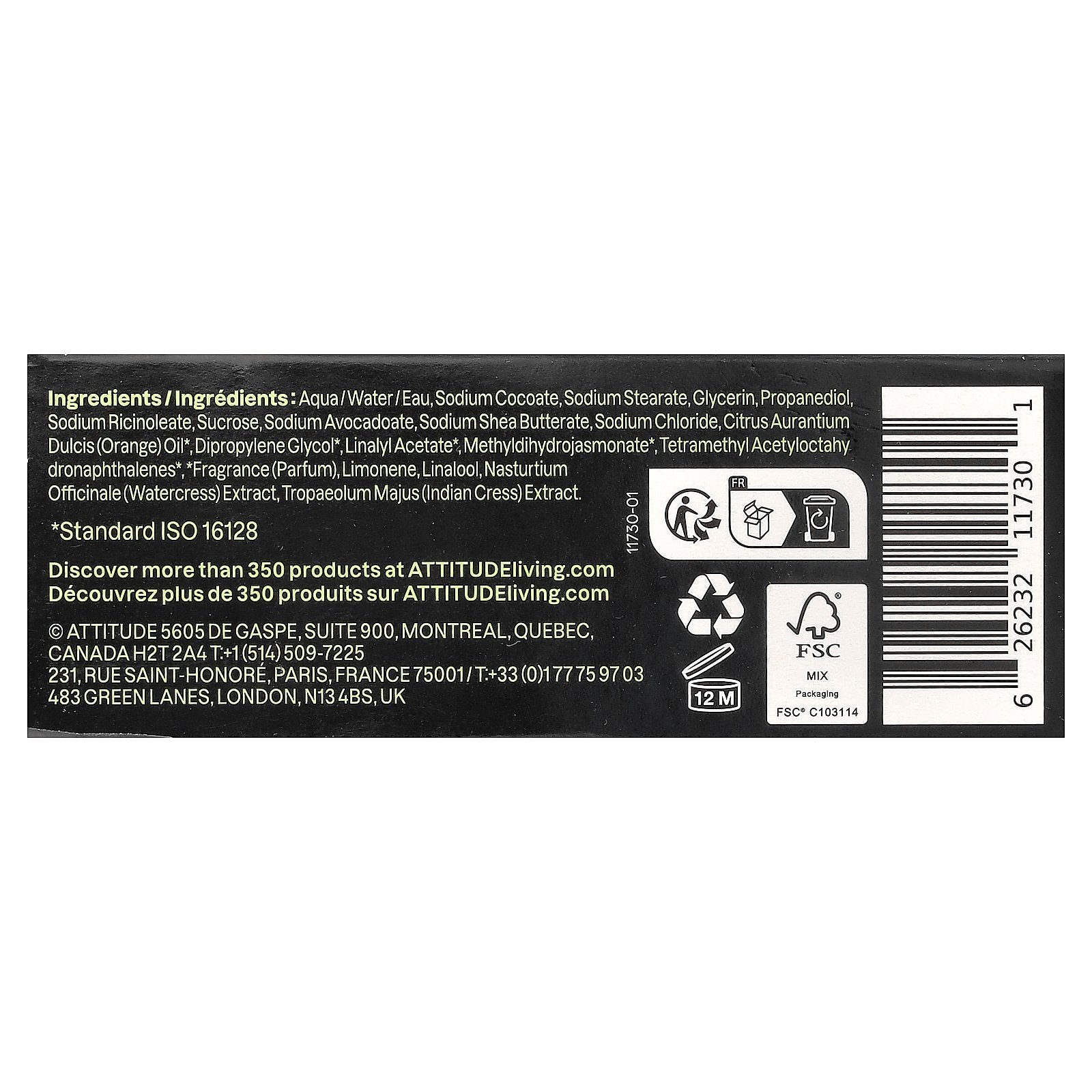 Aqua/water/eau, sodium cocoate, sodium stearate, glycerin, propanediol, sodium ricinoleate, sucrose, sodium avocadoate, sodium shea butterate, sodium chloride, citrus aurantium dulcis (orange) oil *, dipropylene glycol *, linalyl acetate *, methyldihydrojasmonate *, tetramethyl acetyloctahy dronaphthalenes *