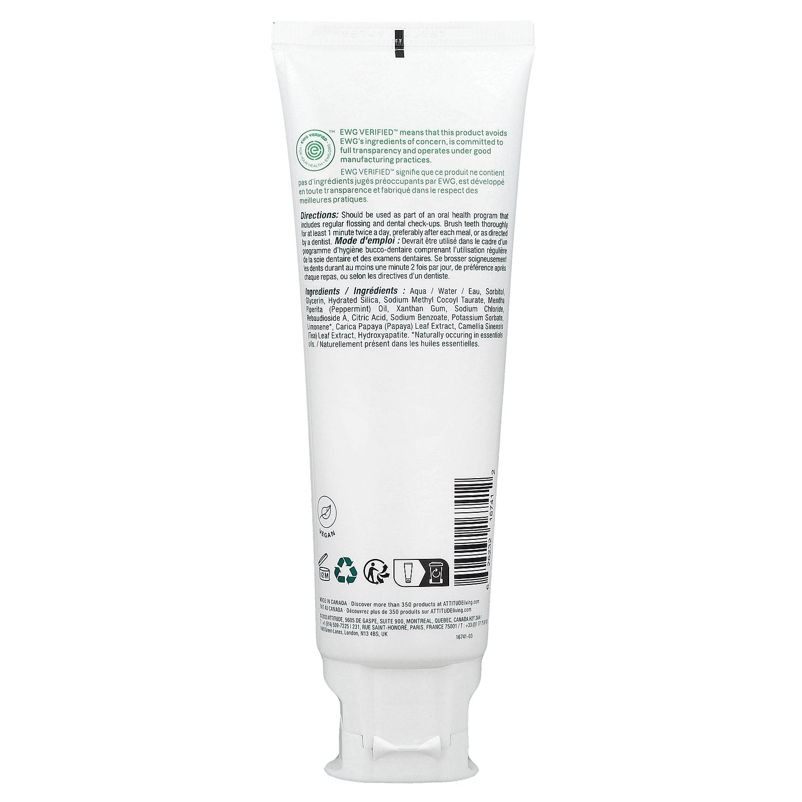 Aqua / water / eau, sorbitol, glycerin, hydrated silica, sodium methyl cocoyl taurate, mentha piperita (peppermint) oil, xanthan gum, sodium chloride, rebaudioside a, citric acid, sodium benzoate, potassium sorbate, limonene *, carica papaya (papaya) leaf extract, camellia sinensis (tea) leaf extract, hydroxyapatite.