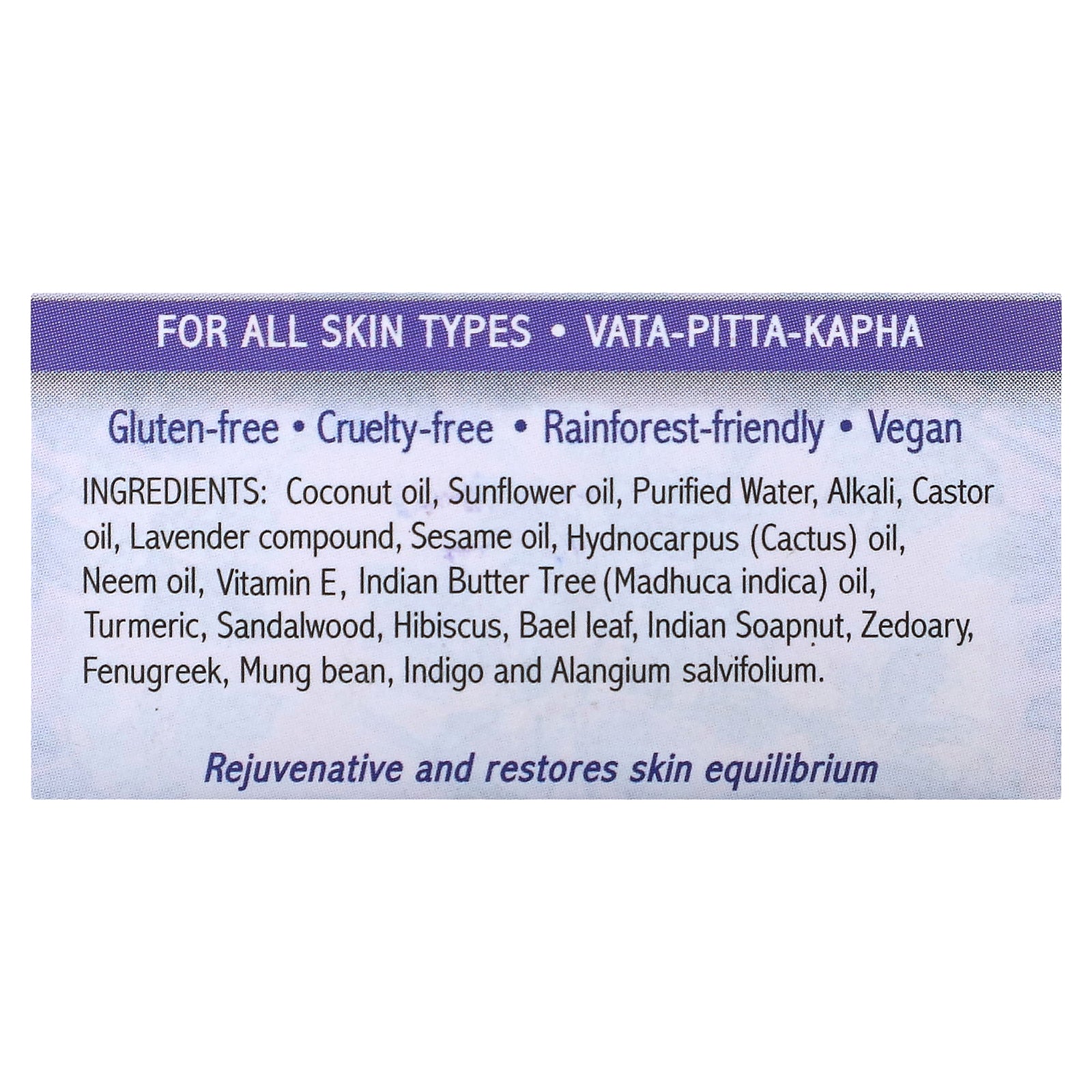 Coconut oil, sunflower oil, purified water, alkali, castor oil, lavender compound, sesame oil, hydnocarpus (cactus) oil, neem oil, vitamin e, indian butter tree (madhuca indica) oil, turmeric, sandalwood, hibiscus, bael leaf, indian soapnut, zedoary, fenugreek, mung bean, indigo and alangium salvifolium.