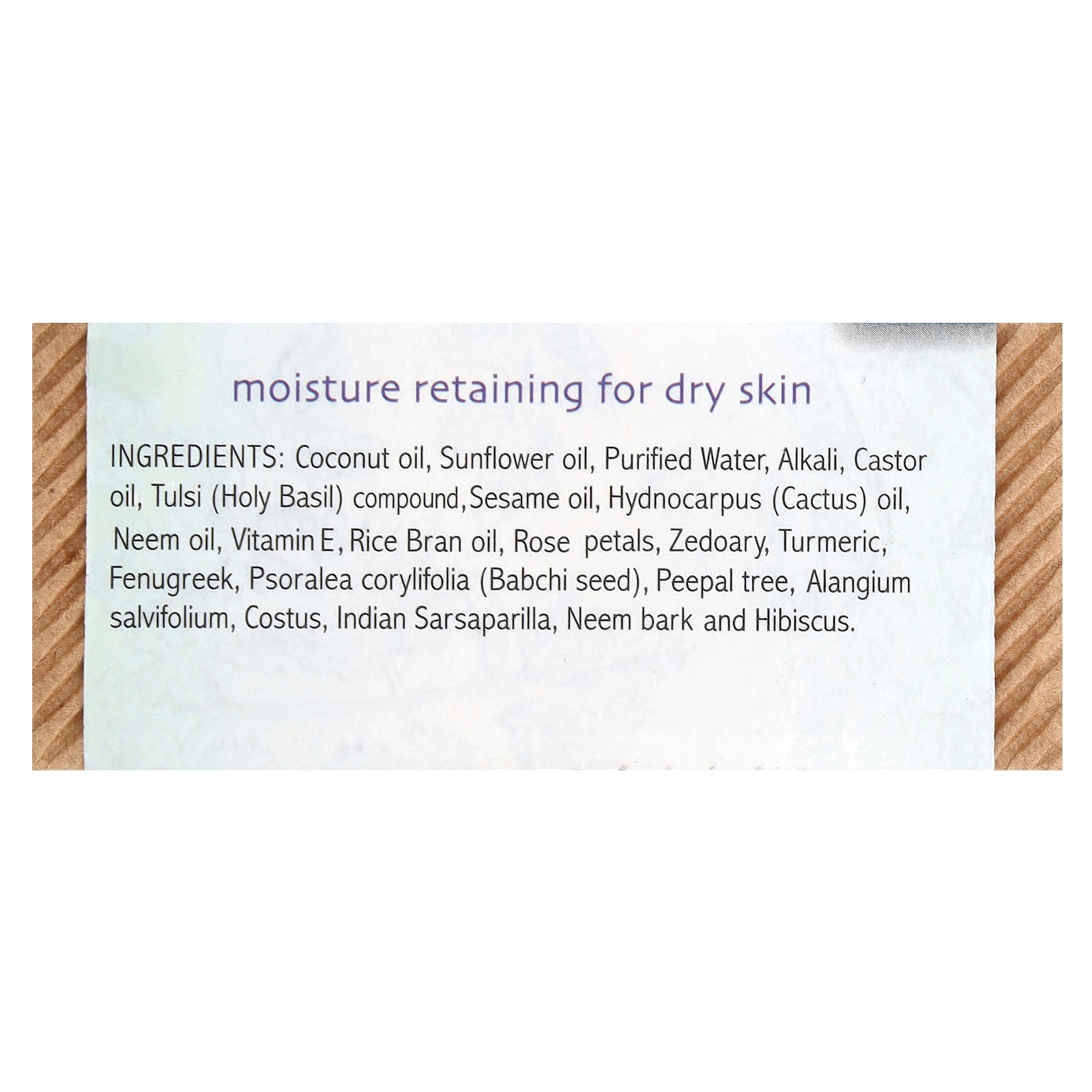 Coconut oil, sunflower oil, purified water, alkali, castor oil, tulsi (holy basil) compound, sesame oil, hydnocarpus (cactus) oil, neem oil, vitamin e, rice bran oil, rose petals, zedoary, turmeric, fenugreek, psoralea corylifolia (babchi seed), peepal tree, alangium salvifolium, costus, indian sarsaparilla, neem bark and hibiscus.