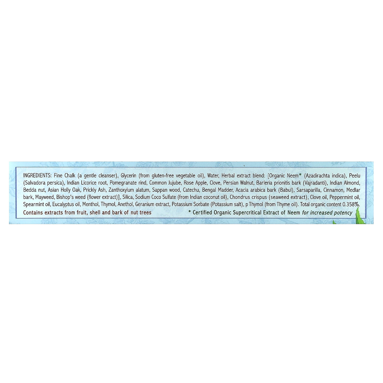 Fine chalk (a gentle cleanser), glycerin (from gluten-free vegetable oil), water, herbal extract blend: [organic neem* (azadirachta indica), peelu (salvadora persica), indian licorice root, pomegranate rind, common jujube, rose apple, clove, Persian walnut, barleria prionitis bark (vajradanti), indian almond, bedda nut, asian holly oak, prickly ash, zanthoxylum alatum, sappan wood, catechu, bengal madder, acacia arabica bark (babul), sarsaparilla, cinnamon, medlar bark, mayweed, bishop's weed (flower extract)], silica, sodium coco sulfate (from indian coconut oil), chondrus crispus (seaweed extract), clove oil, peppermint oil, spearmint oil, eucalyptus oil, menthol, thymol, anethol, geranium extract, potassium sorbate (potassium salt), p thymol (from thyme oil). total organic content 0.358%.