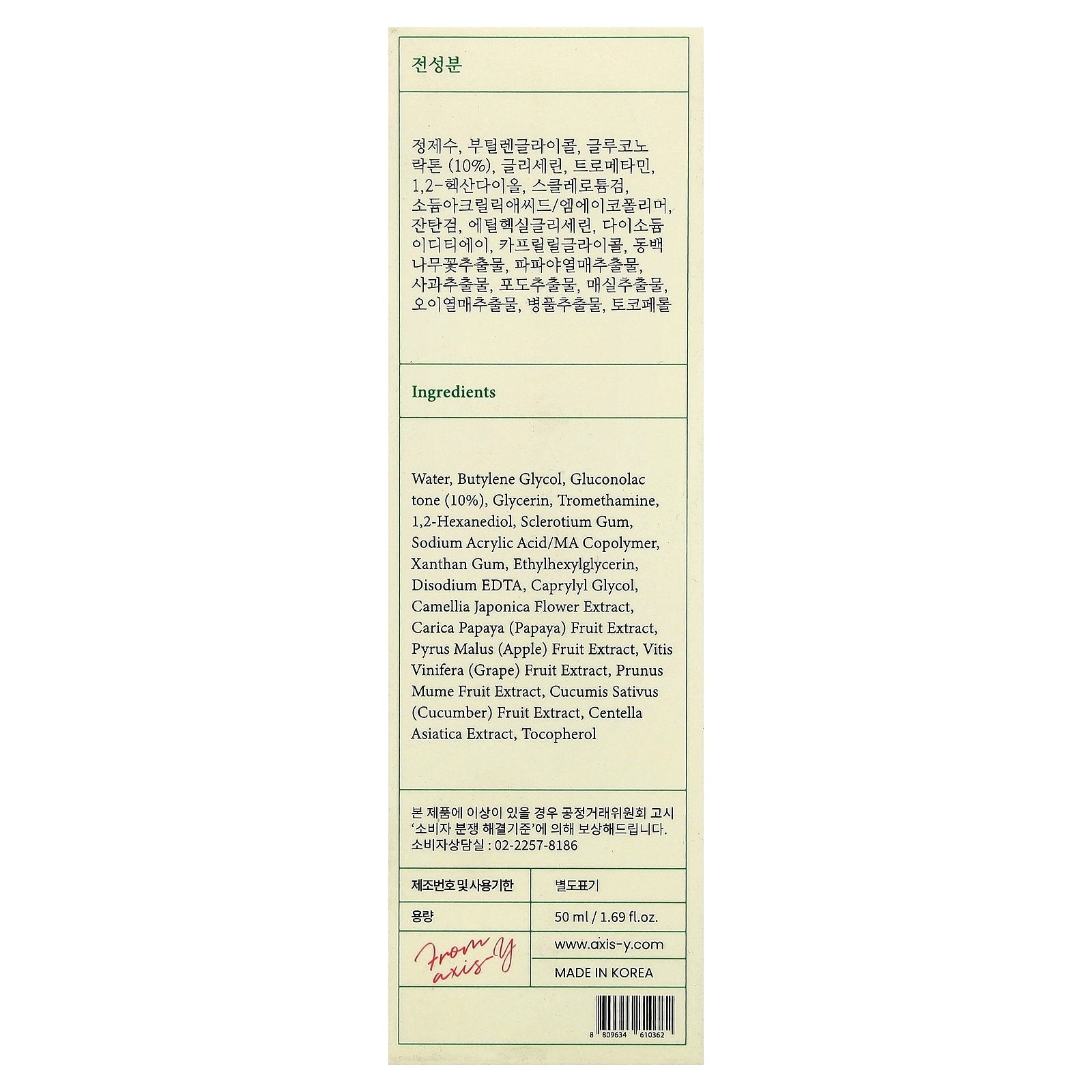 Water, butylene glycol, gluconolactone (10%), glycerin, tromethamine, 1,2-hexanediol, sclerotium gum, sodium acrylic acid/ma copolymer, xanthan gum, ethylhexylglycerin, disodium edta, caprylyl glycol, camellia japonica flower extract, carica papaya (papaya) fruit extract, pyrus malus (apple) fruit extract, vitis vinifera (grape) fruit extract, prunus mume fruit extract, cucumis sativus (cucumber) fruit extract, centella asiatica extract, tocopherol.
