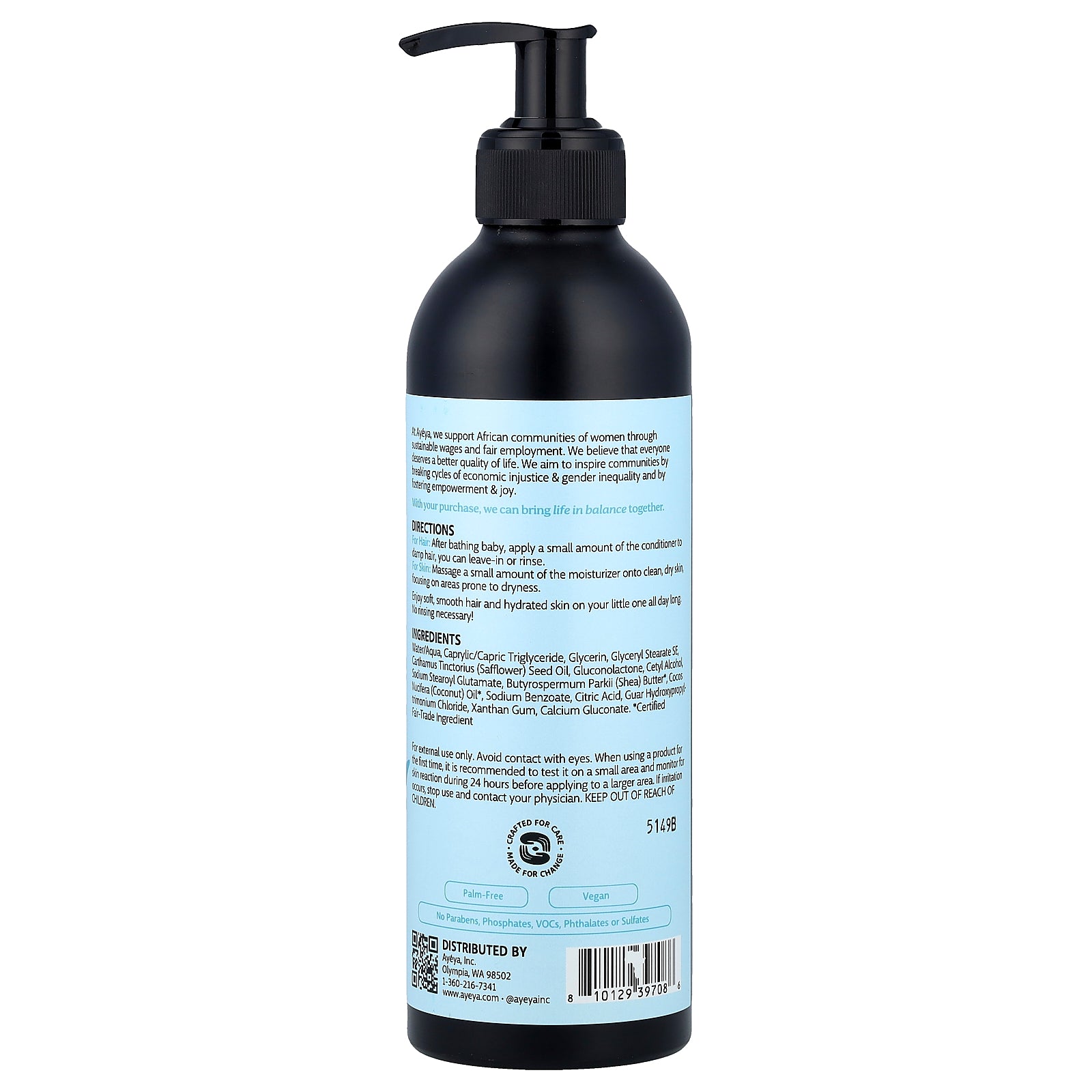 A gentle, multipurpose formula that softens hair and nourishes skin in one simple step. Made with fair trade shea butter and lightweight coconut oil, this 2-in-1 conditioner and moisturizer delivers lasting hydration without heaviness. Whether used as a leave-in or rinse-out conditioner or as a soothing body lotion, it absorbs effortlessly, leaving baby’s hair and skin feeling smooth, soft, and comforted. Fragrance-free and crafted with care for daily use.