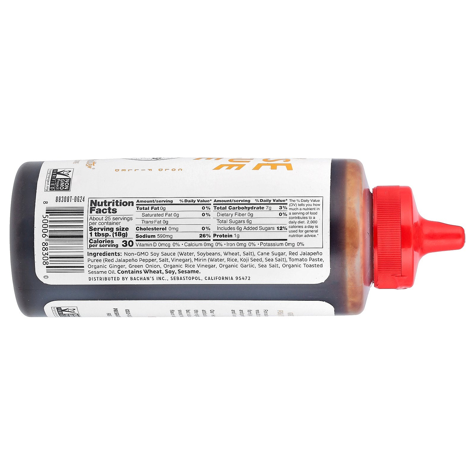 Non-gmo soy sauce (water, soybeans, wheat, salt), cane sugar, red jalapeño puree (red jalapeño pepper, salt, vinegar), mirin (water, rice, koji seed, sea salt), tomato paste, organic ginger, green onion, organic rice vinegar, organic garlic, sea salt, organic toasted sesame oil.