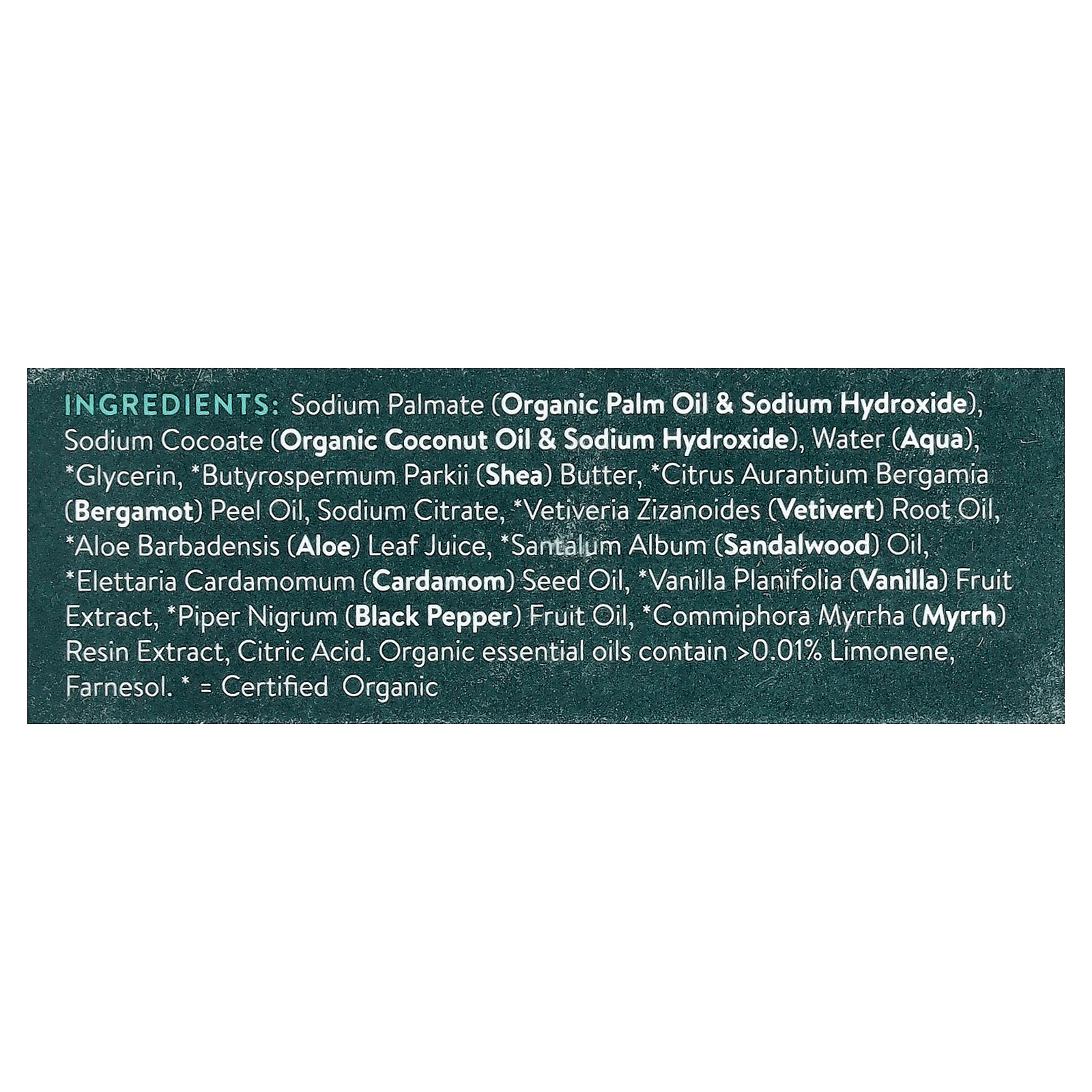 Sodium palmate (organic palm oil & sodium hydroxide), sodium cocoate (organic coconut oil & sodium hydroxide), water (aqua), glycerin, *butyrospermum parkii (shea) butter, *citrus aurantium bergamia (bergamot) peel oil, sodium citrate, *vetiveria zizanoides (vetivert) root oil, aloe barbadensis (aloe) leaf juice, *santalum album (sandalwood) oil, *elettaria cardamomum (cardamom) seed oil, *vanilla planifolia (vanilla) fruit extract, *piper nigrum (black pepper) fruit oil, *commiphora myrrha (myrrh) resin extract, citric acid. Organic essential oils contain > 0.01% limonene, farnesol.