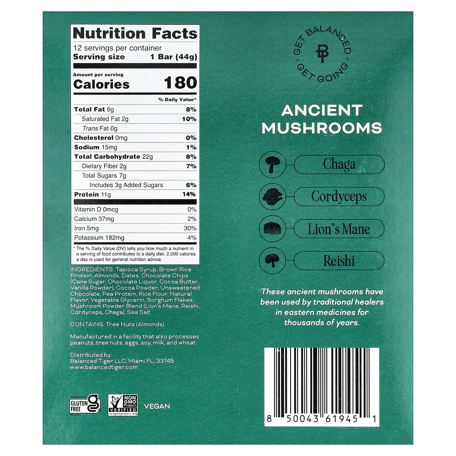 Tapioca syrup, brown rice protein, almonds, dates, chocolate chips (cane sugar, chocolate liquor, cocoa butter, vanilla powder), cocoa powder, unsweetened chocolate, pea protein, rice flour, natural flavor, vegetable glycerin, sorghum flakes, mushroom powder blend (lion's mane, reishi, cordyceps, chaga), sea salt.