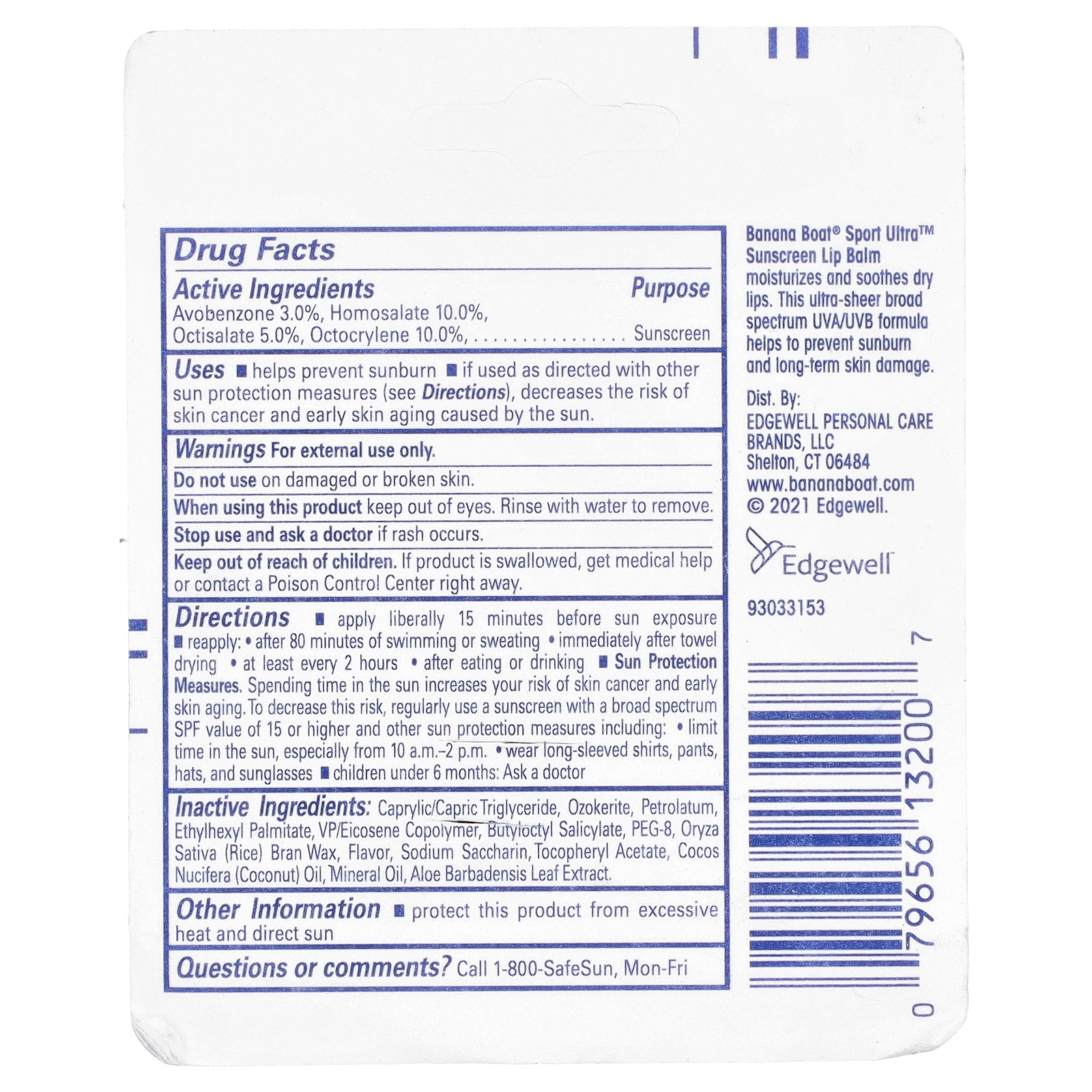 Banana Boat® Sport Ultra™ Sunscreen Lip Balm moisturizes and soothes dry lips. This ultra-sheer broad spectrum UVA/UVB formula helps to prevent sunburn and long-term skin damage.