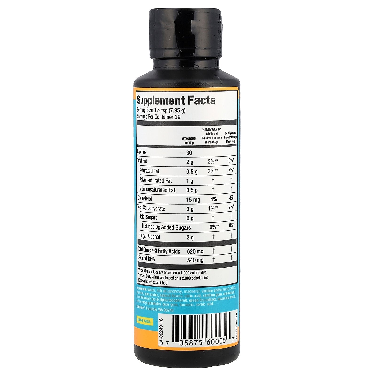Water, fish oil (anchovy, mackerel, sardine and/or tuna), xylitol, glycerine, gum arabic, natural flavors, citric acid, xanthan gum, antioxidant blend (Vitamin E (as d-alpha tocopherol), green tea extract, rosemary extract, and ascorbyl palmitate), guar gum, turmeric, sorbic acid.