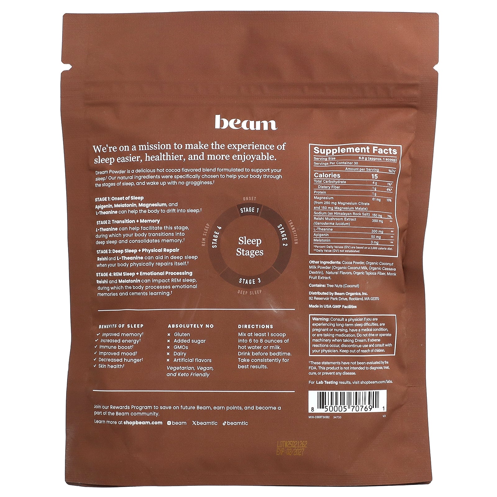 Dream Powder is a delicious hot cocoa flavored blend formulated to improve your sleep. Our natural ingredients were specifically chosen to help your body through the stages of sleep, and wake up with no grogginess.