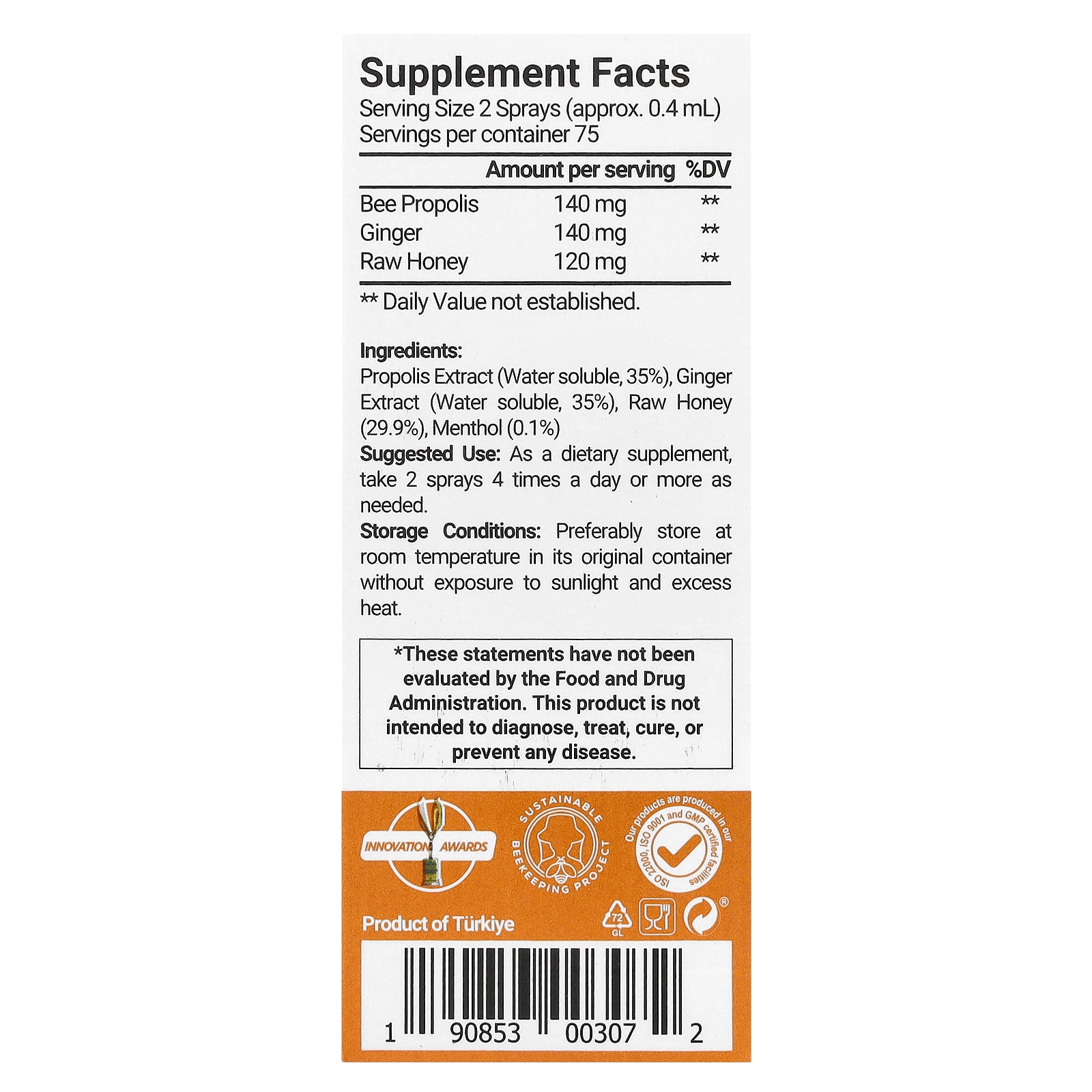 Propolis extract (water soluble, 35%), ginger extract (water soluble, 35%), raw honey (29.9%), menthol (0.1%).