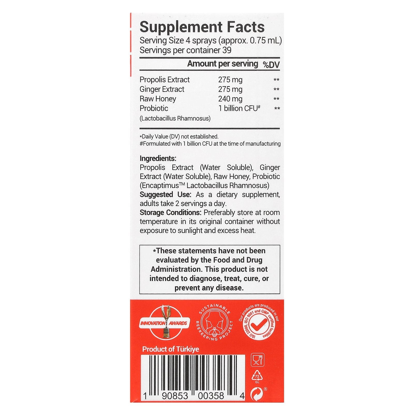 Propolis extract (water soluble), ginger extract (water soluble), raw honey, probiotic (Encaptimus™ Lactobacillus Rhamnosus).
