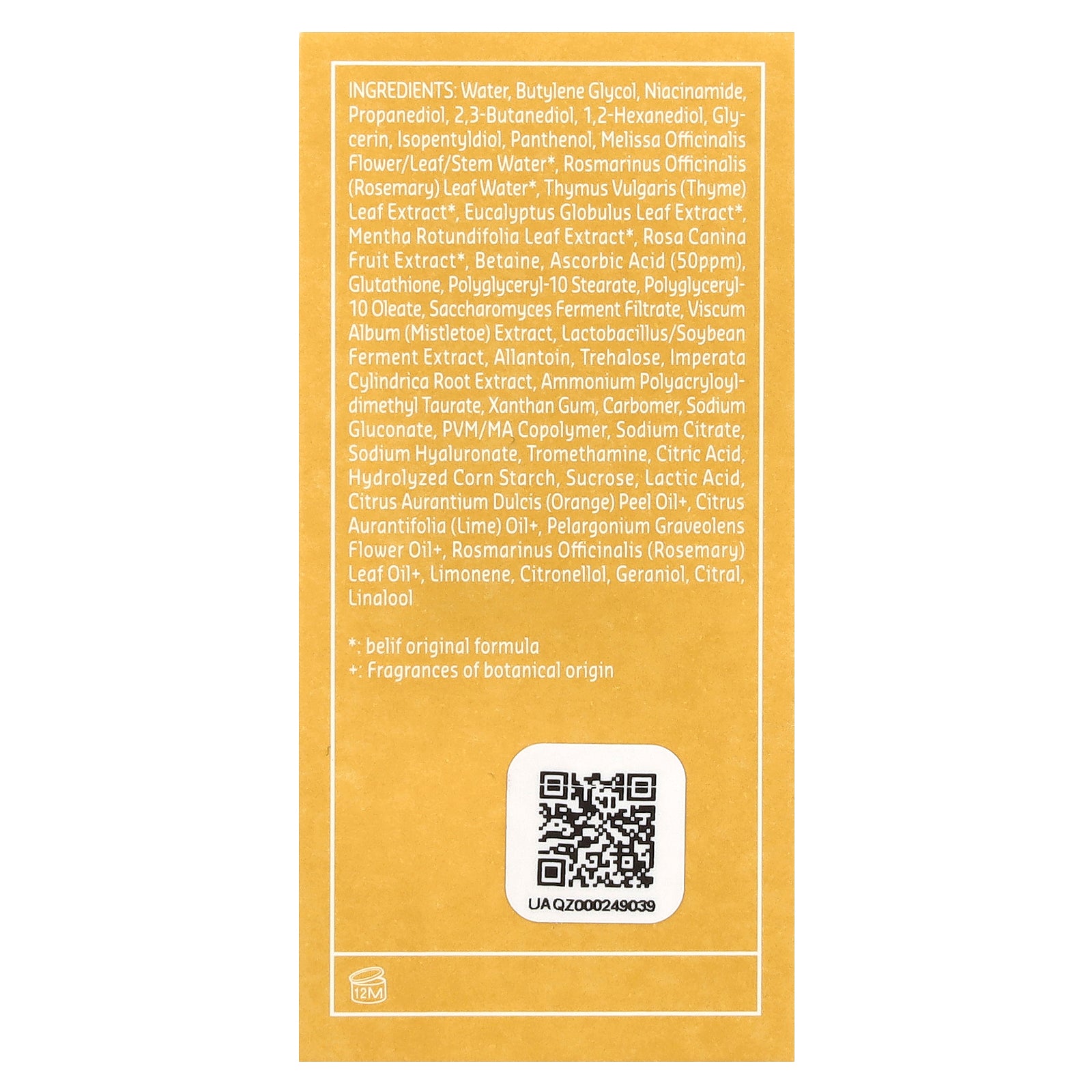 Water, butylene glycol, niacinamide, propanediol, 2,3-butanediol, 1,2-hexanediol, glycerin, isopentyldiol, panthenol, melissa officinalis flower/leaf/stem water*, rosmarinus officinalis (rosemary) leaf water*, thymus vulgaris (thyme) leaf extract *, eucalyptus globulus leaf extract* mentha rotundifolia leaf extract*, rosa canina fruit extract *, betaine, ascorbic acid (50 ppm), glutathione, polyglyceryl-10 stearate, polyglyceryl- 10 oleate, saccharomyces ferment filtrate, viscum album (mistletoe) extract, lactobacillus/soybean ferment extract, allantoin, trehalose, imperata cylindrica root extract, ammonium polyacryloyldimethyl taurate, xanthan gum, carbomer, sodium gluconate, pvm/ma copolymer, sodium citrate, sodium hyaluronate, tromethamine, citric acid, hydrolyzed corn starch, sucrose, lactic acid, citrus aurantium dulcis (orange) peel oil+, citrus aurantifolia (lime) oil+, pelargonium graveolens flower oil+, rosmarinus officinalis (rosemary) leaf oil+, limonene, citronellol, geraniol, citral, linalool.