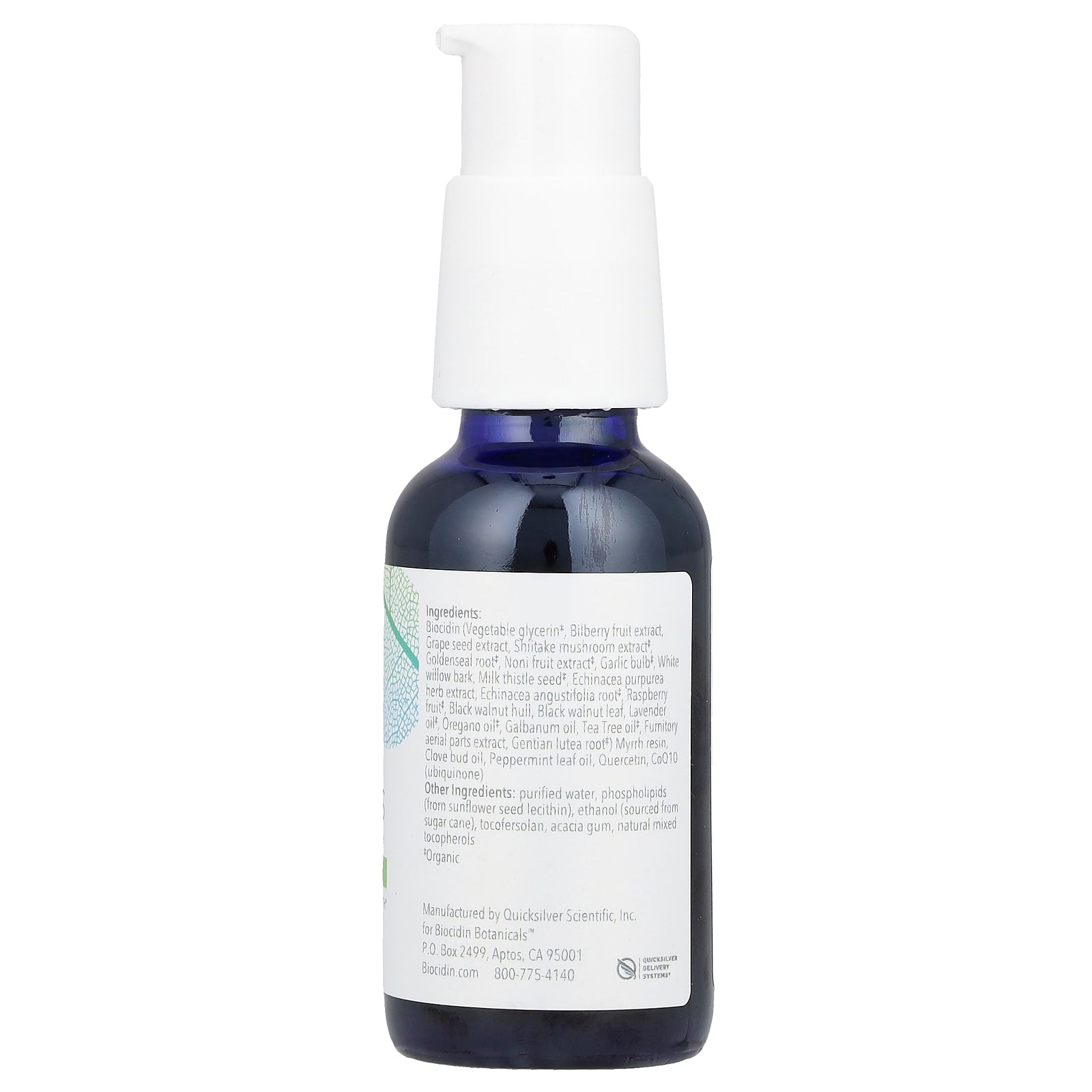 Biocidin (vegetable glycerin‡, bilberry fruit extract, grape seed extract, shiitake mushroom extract‡, goldenseal root‡, noni fruit extract‡, garlic bulb‡, white willow bark, milk thistle seed‡, echinacea purpurea herb extract, echinacea angustifolia root‡, raspberry fruit‡, black walnut hull, black walnut leaf, lavender oil‡, oregano oil‡, galbanum oil, tea tree oil‡, fumitory aerial parts extract, gentian lutea root‡) myrrh resin, clove bud oil, peppermint leaf oil, quercetin, CoQ10 (ubiquinone).