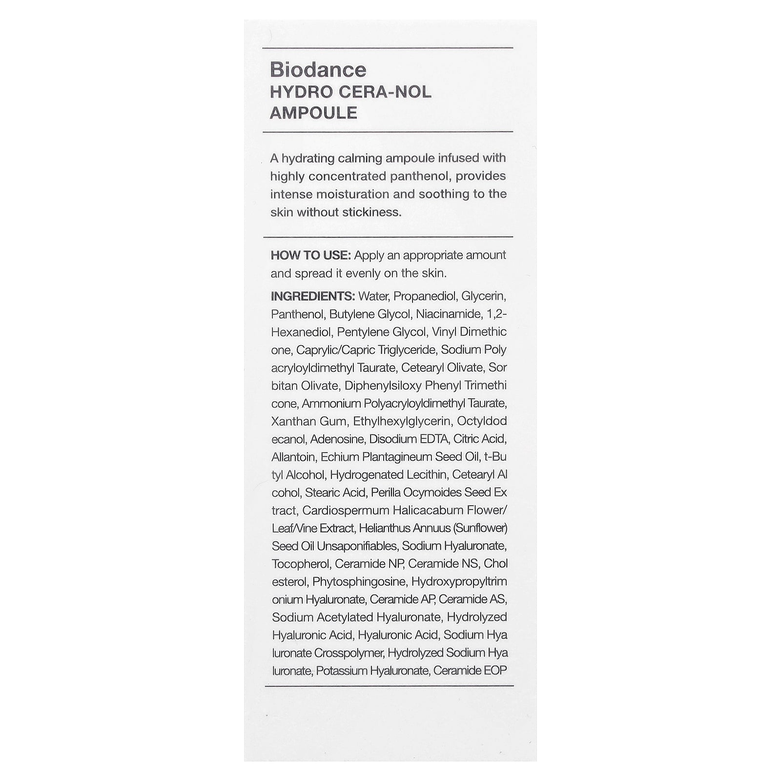 A hydrating calming ampoule infused with highly concentrated panthenol, provides intense moisturization and soothing to the skin without stickiness.