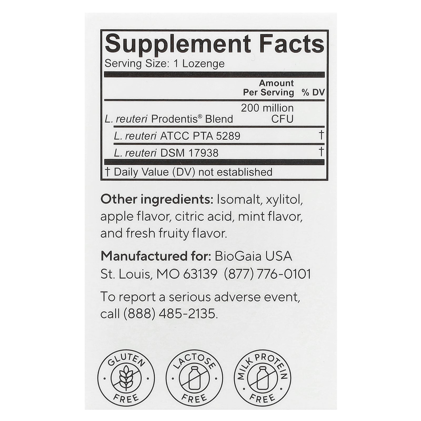 | L. reuteri Prodentis® Blend | 200 million CFU | |