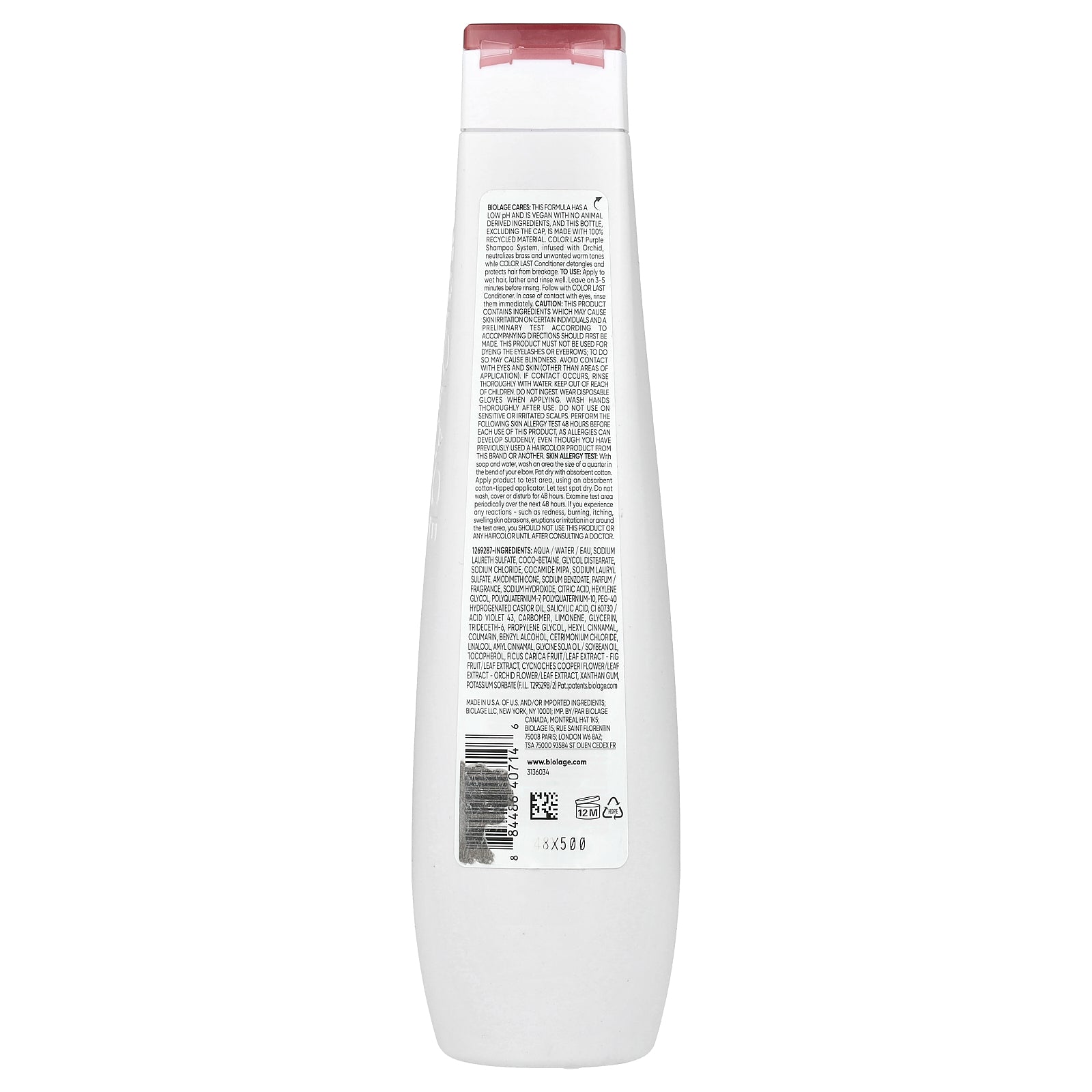 Biolage Cares: This formula has a low pH and is vegan with no animal derived ingredients, and this bottle, excluding the cap, is made with 100% recycled material. Color Last Purple Shampoo System, infused with Orchid, neutralizes brass and unwanted warm tones while Color Last Conditioner detangles and protects hair from breakage.