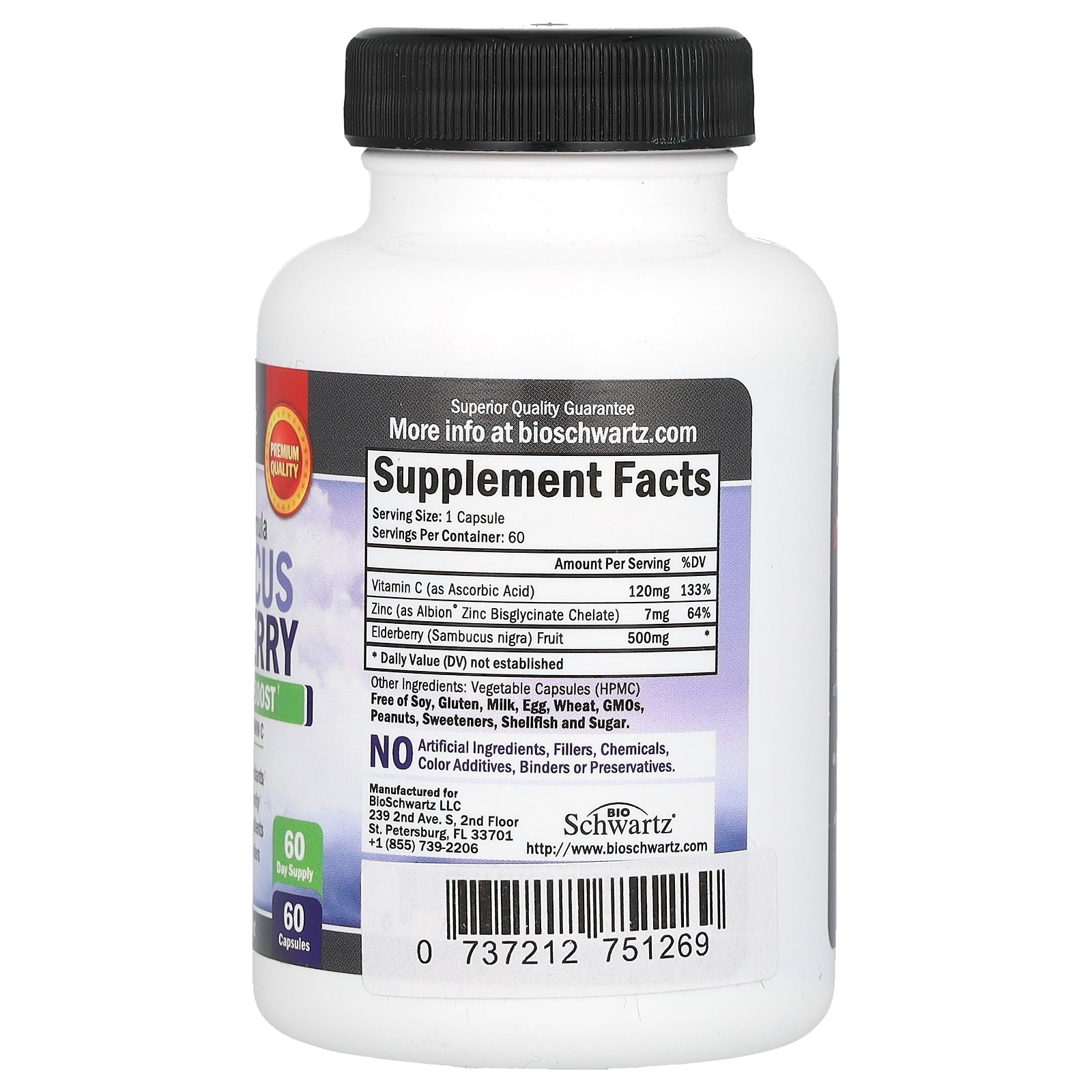 BioSchwartz Sambucus Elderberry Capsules contain Zinc, which can be vital in boosting the immune system by interfering with processes that cause mucus and bacteria buildup within nasal passages and while also supporting the health of immune cells.