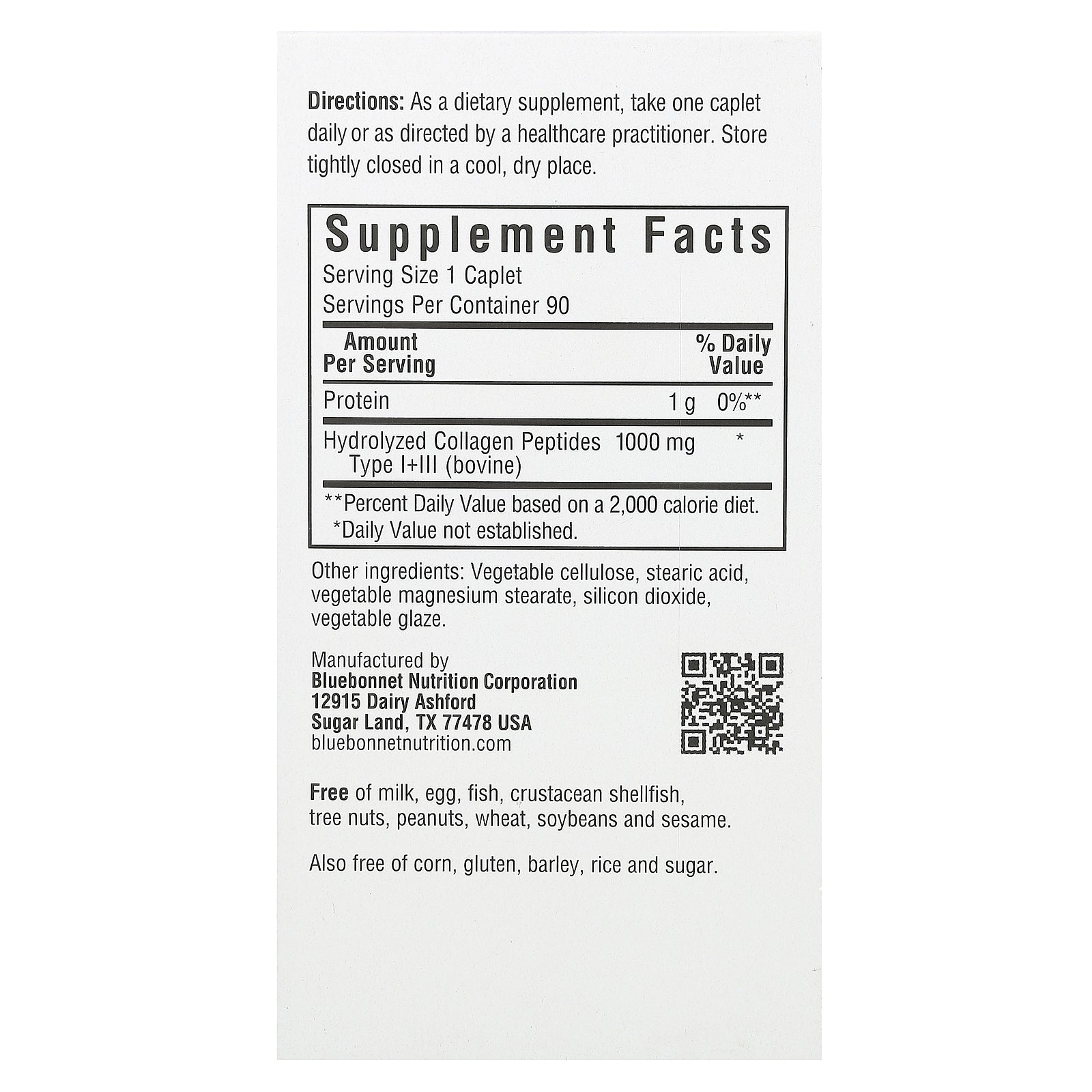 Bluebonnet’s Beautiful Ally® Collagen 1000 mg Caplets are specially formulated to help support skin, hair and nails with collagen peptides type I + III from grass-fed cows. Collagen peptides help to replenish nutrients lost over time by boosting collagen production which helps to strength hair and nails while supporting the skin's hydration balance and elasticity to counteract visible signs of aging.