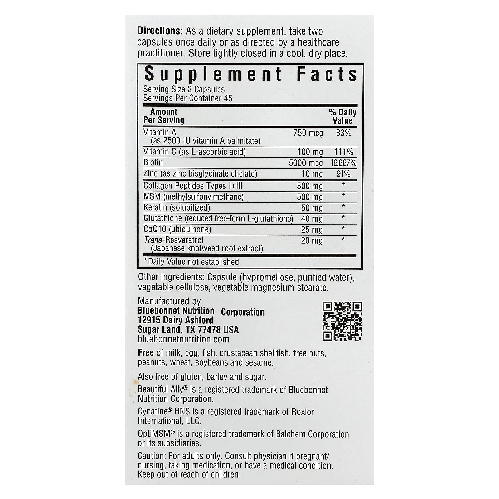 Bluebonnet's Beautiful Ally® Hair, Skin & Nails Vegetable Capsules are specially formulated to help protect, maintain and nourish hair, skin and nails daily with vitamins, minerals and other ingredients like L-glutathione, type I + III collagen peptides, keratin, and MSM. These beauty nutrients provide the body with the building blocks necessary to help improve the strength and appearance of hair and nails while supporting skin moisture, elasticity, and radiance from the inside out.