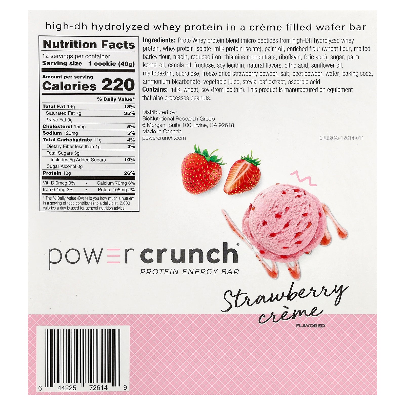 Proto Whey protein blend (micro peptides from high-DH hydrolyzed whey protein, whey protein isolate, milk protein isolate), palm oil, enriched flour (wheat flour, malted barley flour, niacin, reduced iron, thiamine mononitrate, riboflavin, folic acid), sugar, palm kernel oil, canola oil, fructose, soy lecithin, natural flavors, citric acid, sunflower oil, maltodextrin, sucralose, freeze dried strawberry powder, salt, beet powder, water, baking soda, ammonium bicarbonate, vegetable juice, stevia leaf extract, ascorbic acid.