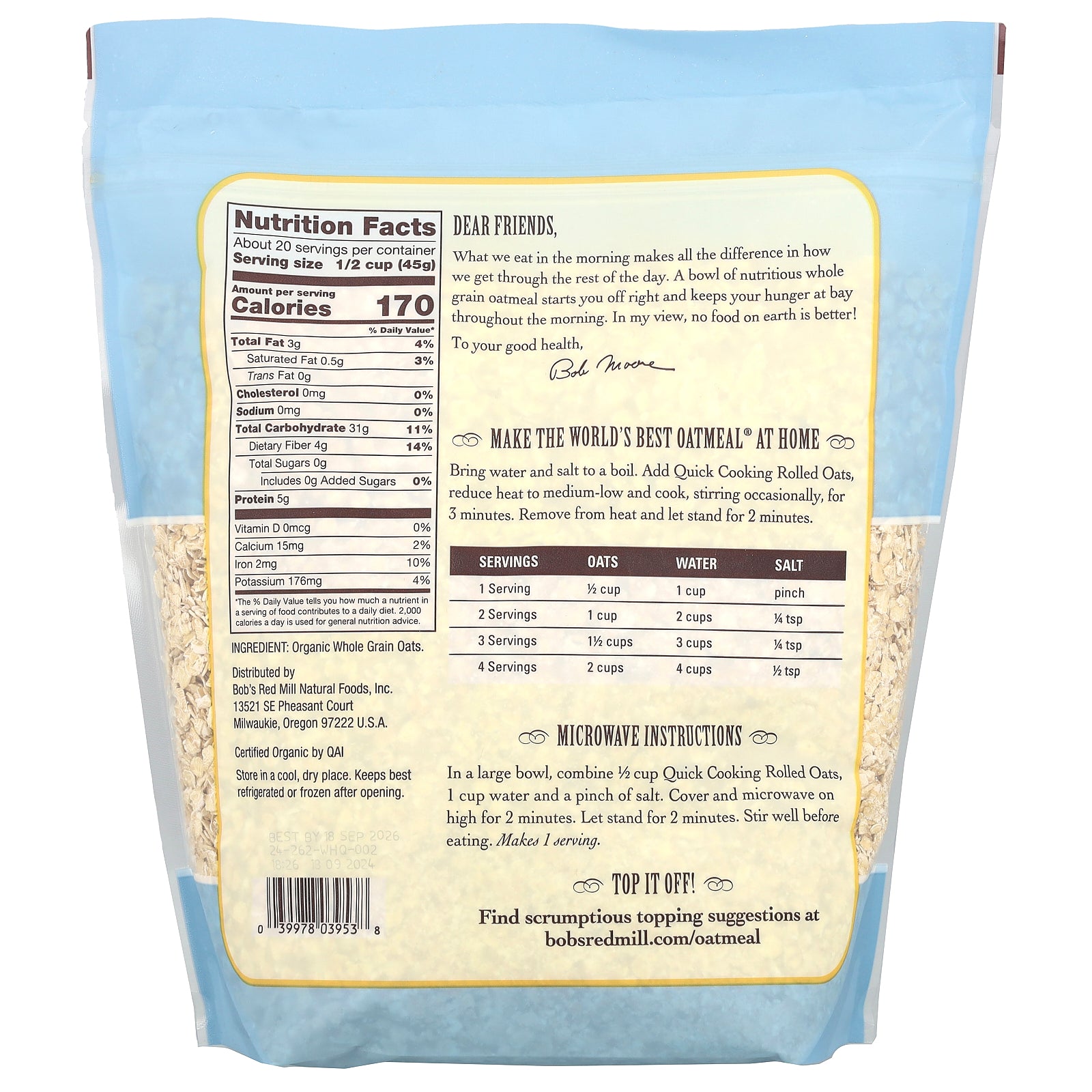 Microwave Instructions: In a large bowl, combine 1/2 cup Quick Cooking Rolled Oats, 1 cup water and a pinch of salt. Cover and microwave on high for 2 minutes. Let stand for 2 minutes. Stir well before eating. Makes 1 serving.