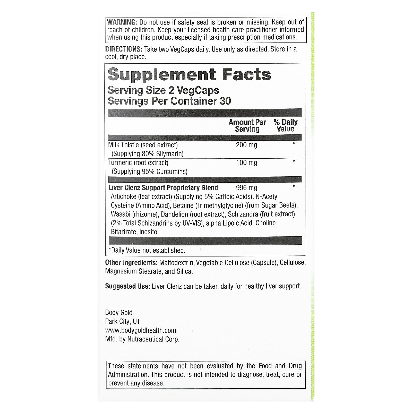 Liver Clenz Support Proprietary Blend Artichoke (leaf extract) (Supplying 5% Caffeic Acids), N-Acetyl Cysteine (Amino Acid), Betaine (Trimethylglycine) (from Sugar Beets), Wasabi (rhizome), Dandelion (root extract), Schizandra (fruit extract) (2% Total Schizandrins by UV-VIS), alpha Lipoic Acid, Choline Bitartrate, Inositol |