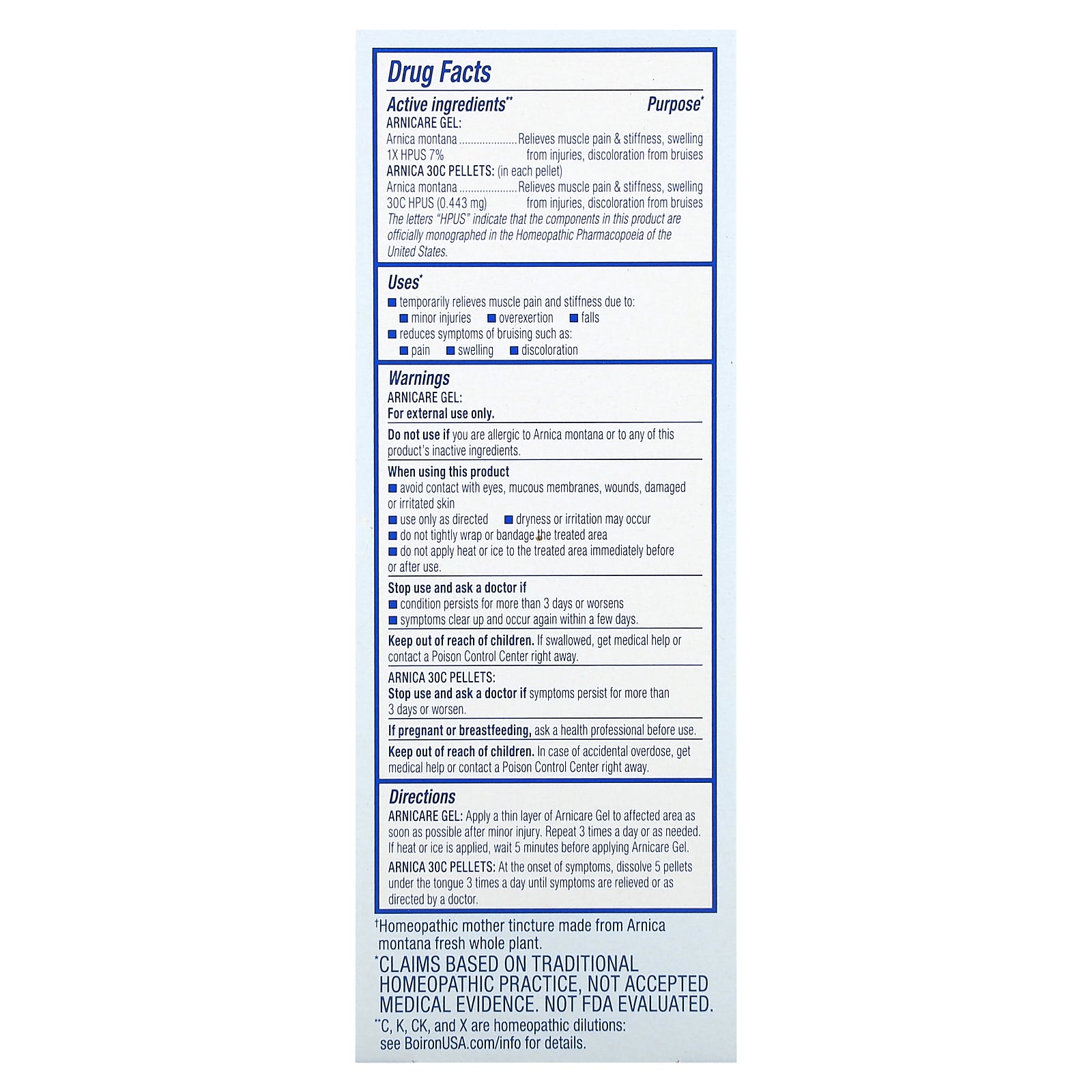 Arnicare Gel: alcohol, carbomer, purified water, sodium hydroxide. Arnica 30C Pellets: lactose, sucrose. |