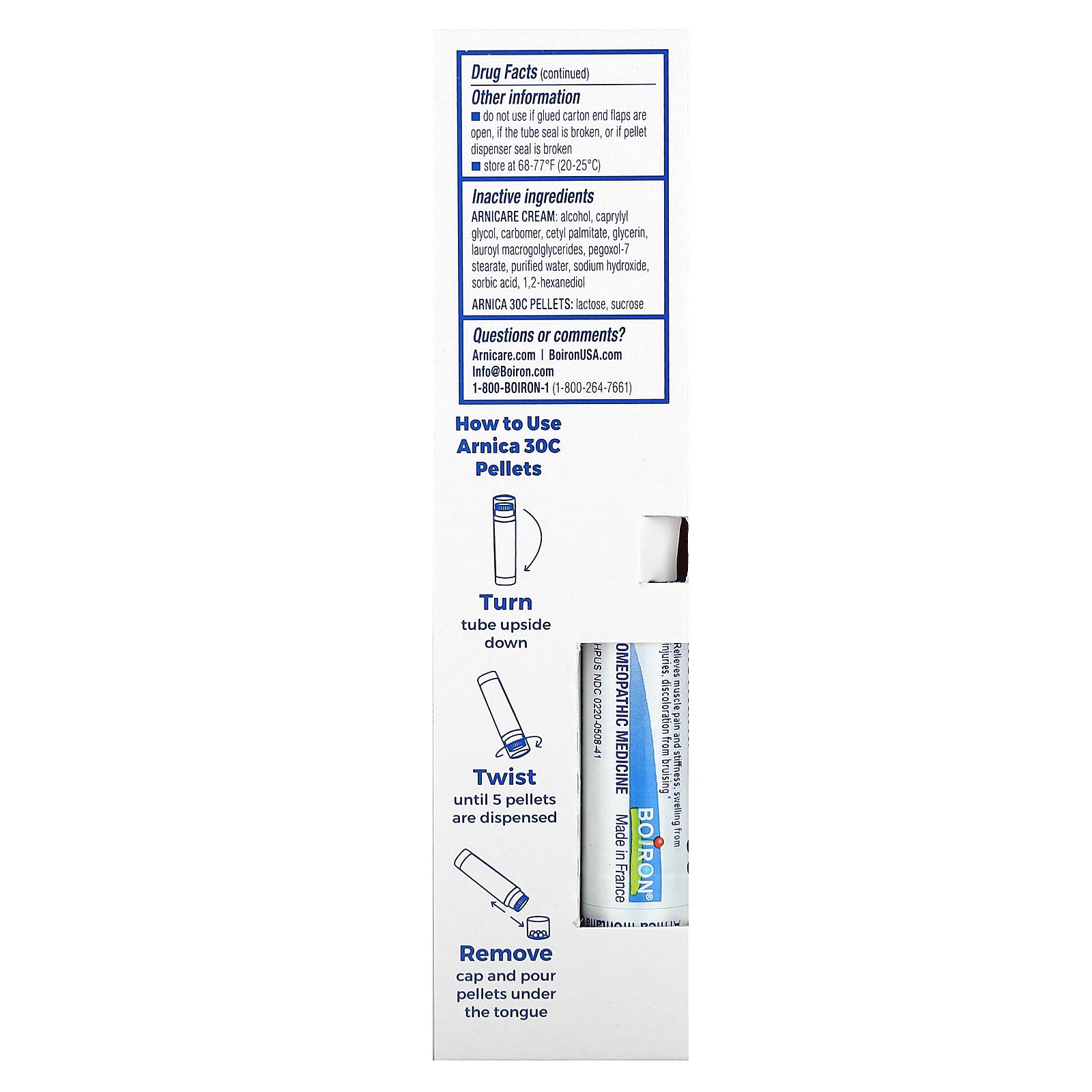 Arnica Cream: Alcohol, caprylyl glycol, carbomer, cetyl palmitate, glycerin, lauroyl macrogolglycerides, pegoxol-7 stearate, purified water, sodium hydroxide, sorbic acid, 1,2-hexanediol. Arnica 30C Pellets: Lactose, sucrose | |