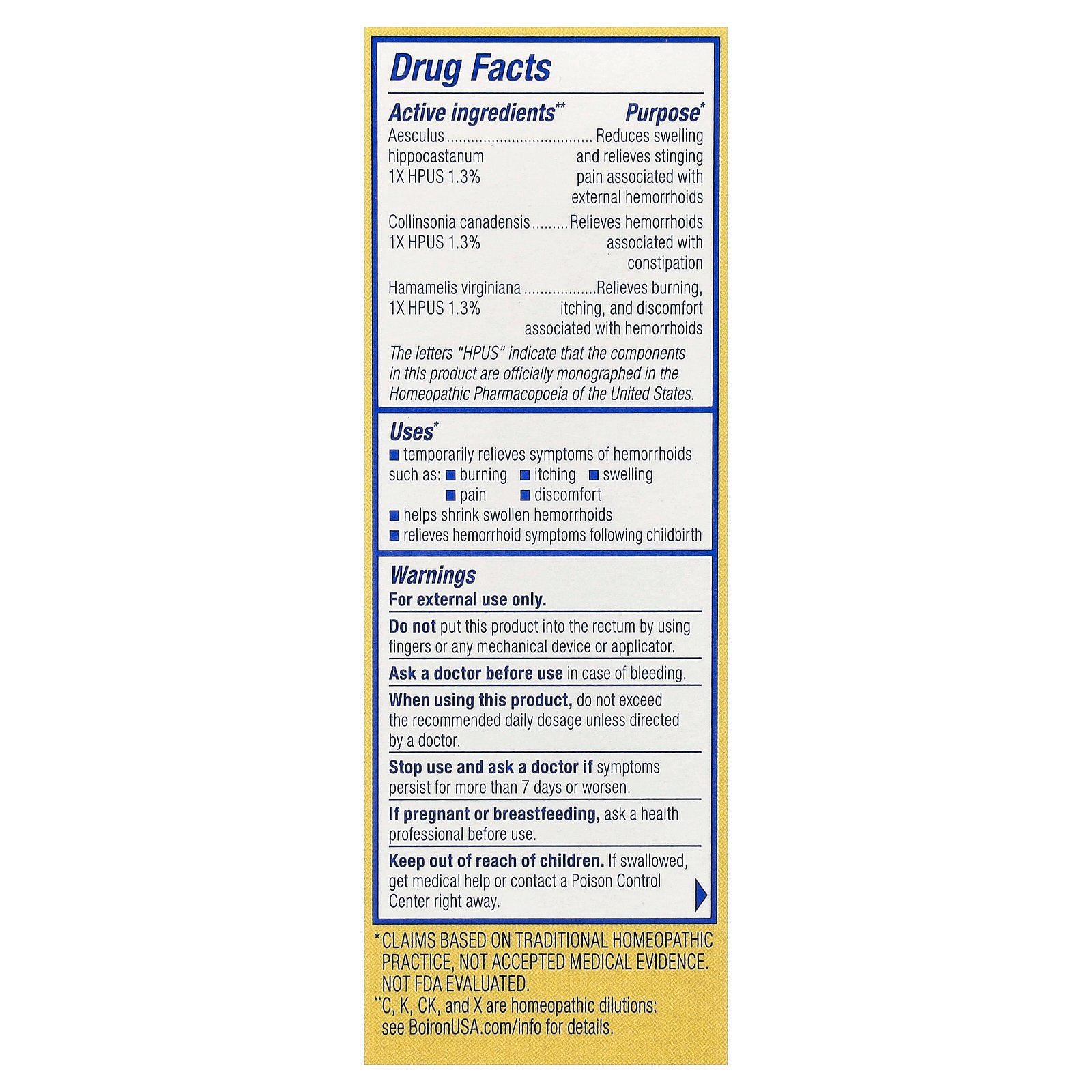 | Aesculus hippocastanum 1X HPUS 1.3% | Reduces swelling and relieves stinging pain associated with external hemorrhoids |