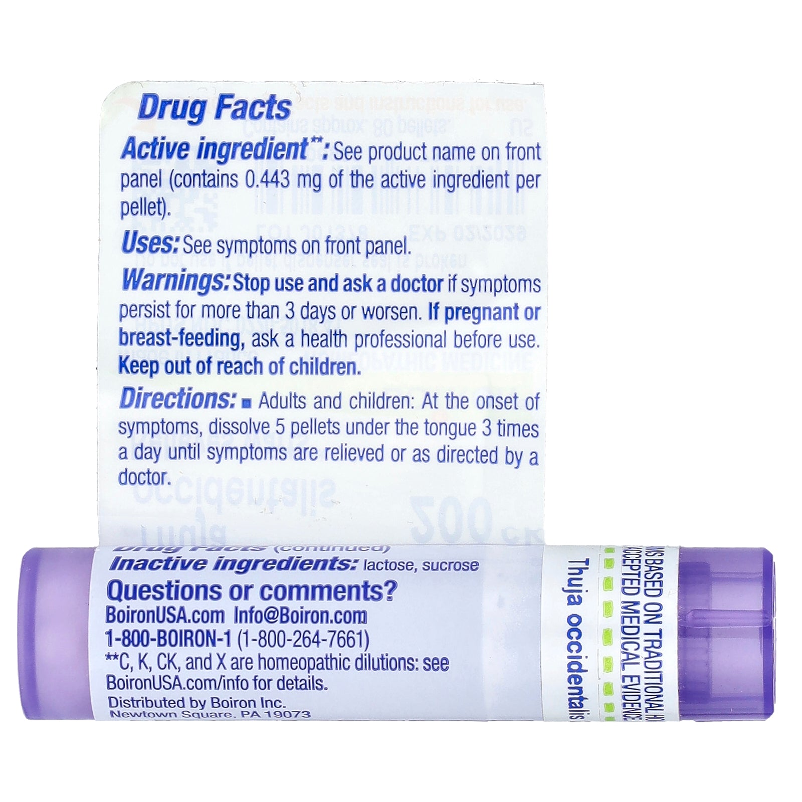 | Thuja Occidentalis, 200 CK, (contains 0.443 mg of the active ingredient per pellet) |