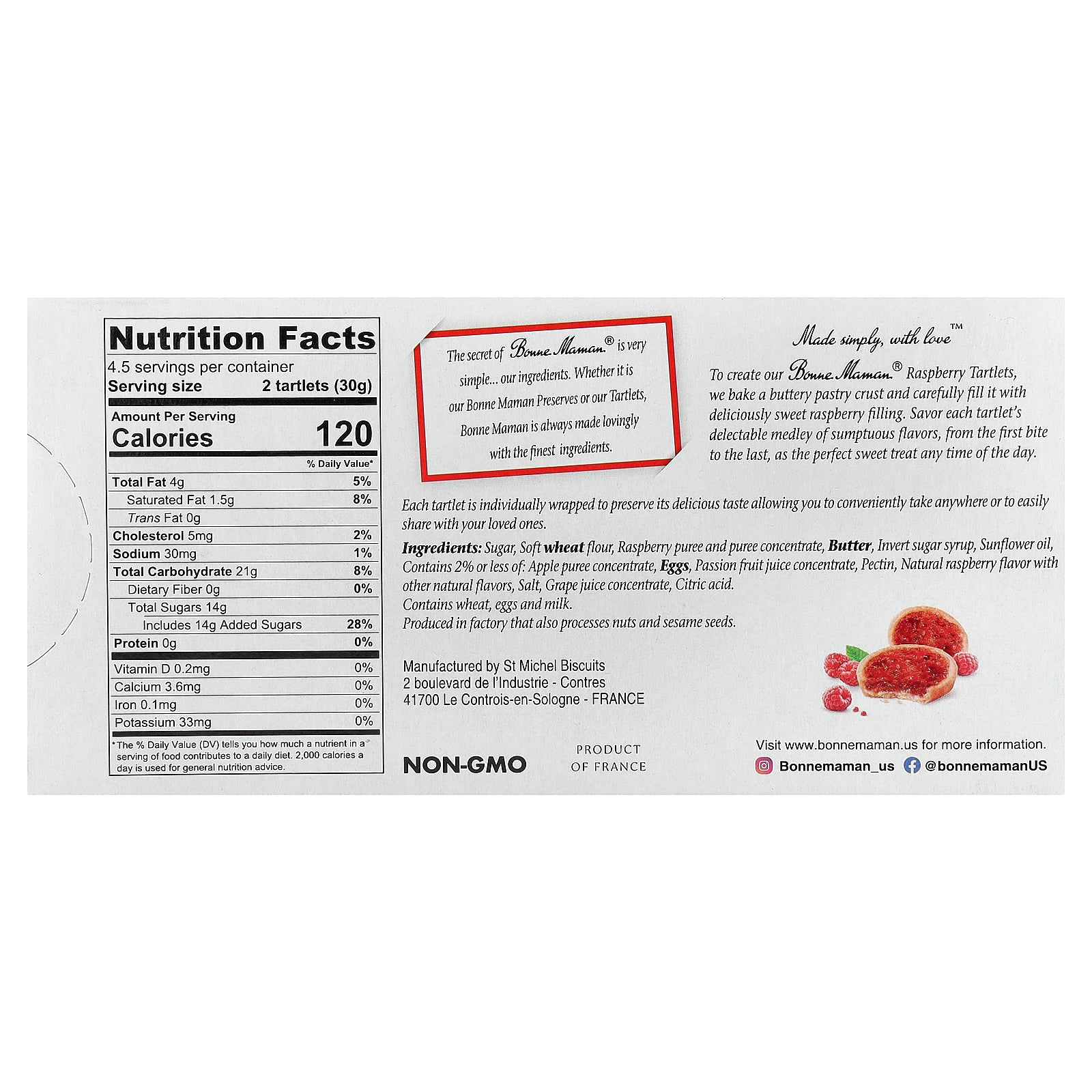 To create our Bonne Maman.® Raspberry Tartlets, we bake a buttery pastry crust and carefully fill it with deliciously sweet raspberry filling. Savor each tartlet's delectable medley of sumptuous flavors, from the first bite to the last, as the perfect sweet treat any time of the day.
