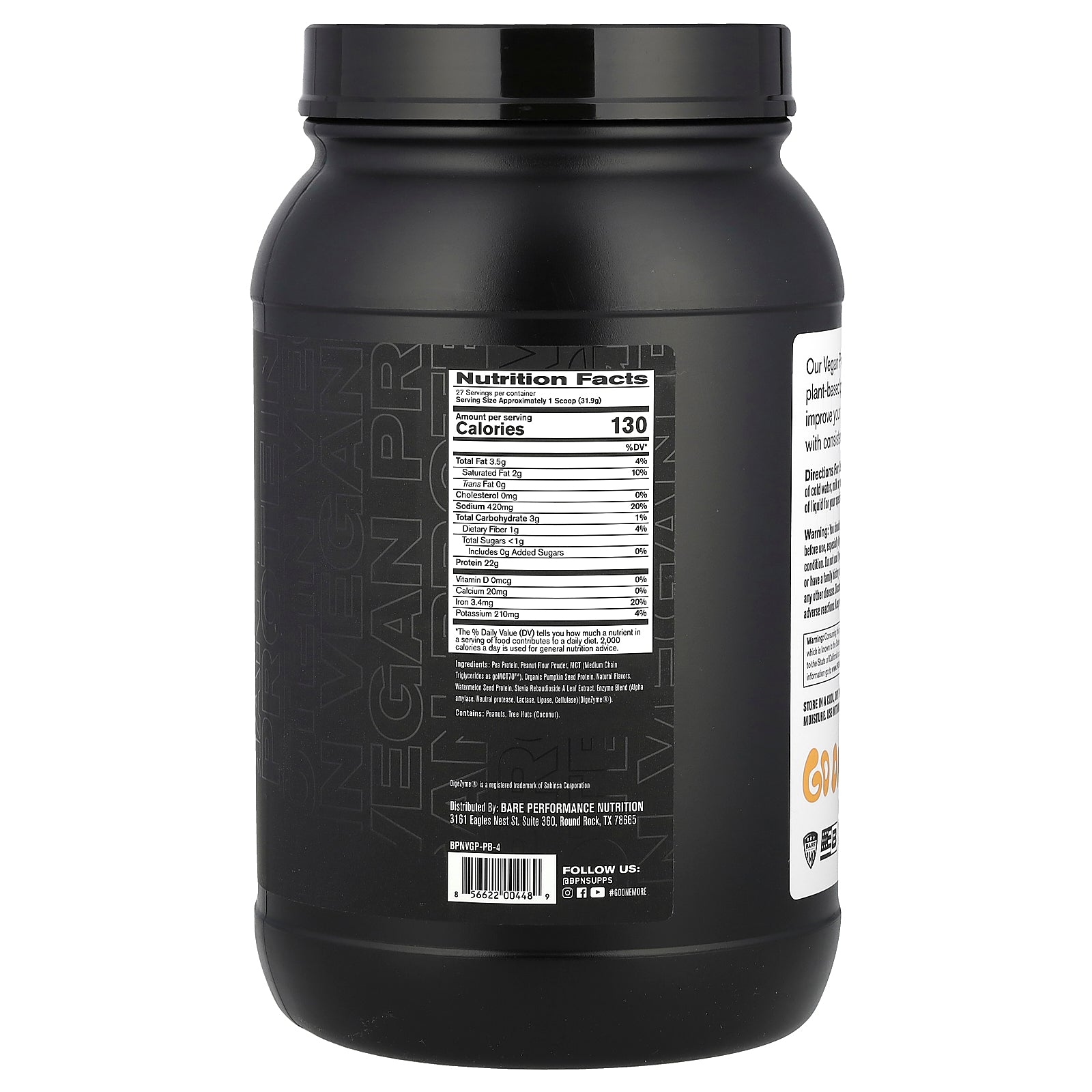 Pea protein, peanut flour powder, MCT (medium chain triglycerides as goMCT70™), organic pumpkin protein, natural flavors, watermelon seed protein, stevia rebaudioside a leaf extract, enzyme blend (alpha amylase, neutral protease, lactase, lipase, cellulase) (Digezyme®).