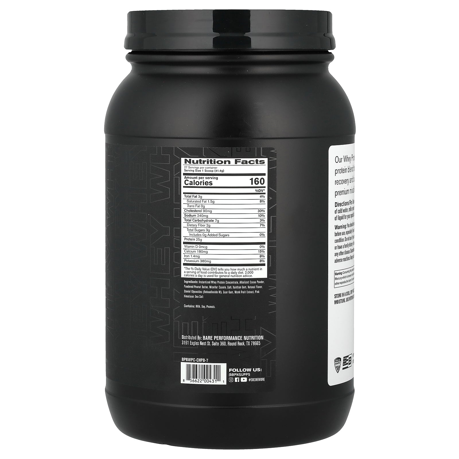Instantized whey protein concentrate, alkalized cocoa powder, powdered peanut butter, micellar casein, salt, xanthan gum, natural flavor, steviol glycosides (rebaudioside m), guar gum, monk fruit extract, pink himalayan sea salt.