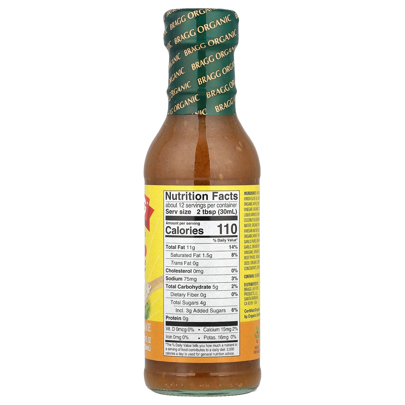 Bragg® Organic Ginger & Sesame Dressing includes the delicious flavor of Bragg® Organic Coconut Liquid Aminos, organic ginger and organic sesame seeds, blended into a smooth, zesty dressing.
