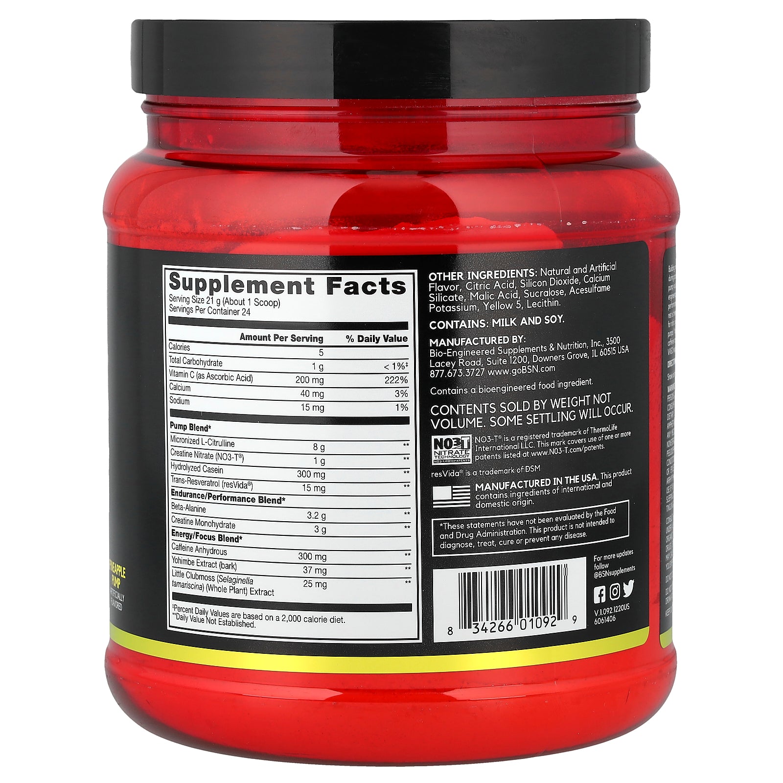 Building muscle requires proper nutrition and the best workouts. Who doesn't want an outrageous pump during an amazing workout? Many pre-workout supplements deliver energy and focus, but fail to deliver the pump you are after. Thanks to N.O.-XPLODE VASO your search is over! N.O.-XPLODE VASO is scientifically engineered to deliver real pumps, as well as the power to drive energy, endurance, focus and muscle performance. You get exactly what you need every time! What really separates N.O.-XPLODE VASO from the rest is the skin splitting pumps you get from 8 g of citrulline and 1g of creatine nitrate NO3-T® to supply nitrates for nitric oxide precursors, topped with 25 mg of selaginella, hydrolyzed casein and resveratrol for next level pumps! You also get 3.2 g of beta alanine for endurance, along with energy and focus from 300 mg of caffeine and 37 mg of yohimbe extract. Available in a variety of exciting flavors from BSN, N.O.-XPLODE VASO helps you maximize every workout because nothing works like N.O.-XPLODE VASO!