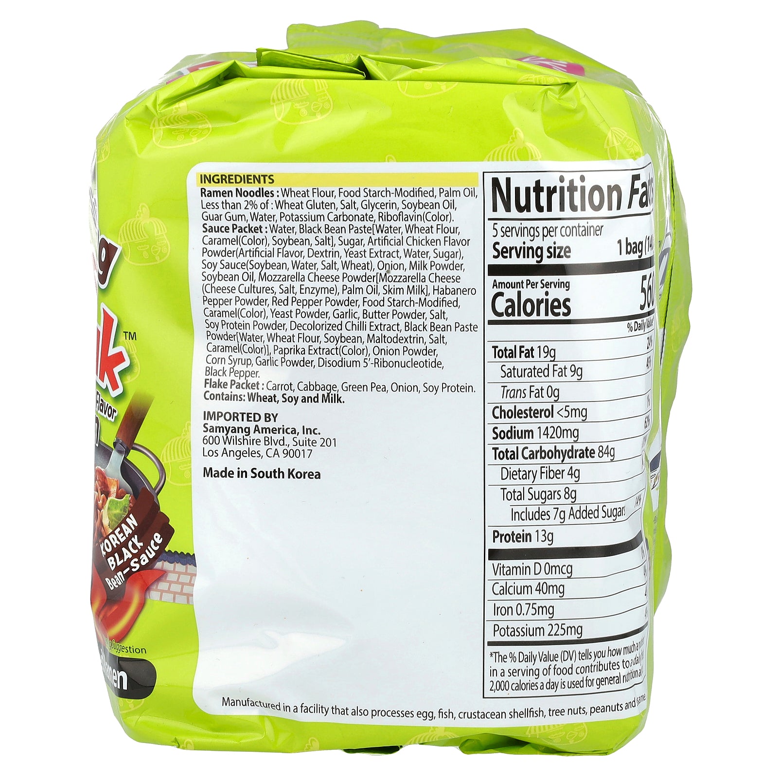 Sauce packet: water, black bean paste[water, wheat flour, caramel (color), soybean, salt], sugar, artificial chicken flavor powder(artificial flavor, dextrin, yeast extract, water, sugar), soy sauce(soybean, water, salt, wheat), onion, milk powder, soybean oil, mozzarella cheese powder [mozzarella cheese (cheese cultures, salt, enzyme), palm oil, skim milk], habanero pepper powder, red pepper powder, food starch-modified, caramel (color), yeast powder, garlic, butter powder, salt, soy protein powder, decolorized chili extract, black bean paste powder[water, wheat flour, soybean, maltodextrin, salt, caramel (color)], paprika extract (color), onion powder, corn syrup, garlic powder, disodium 5'-ribonucleotide, black pepper.