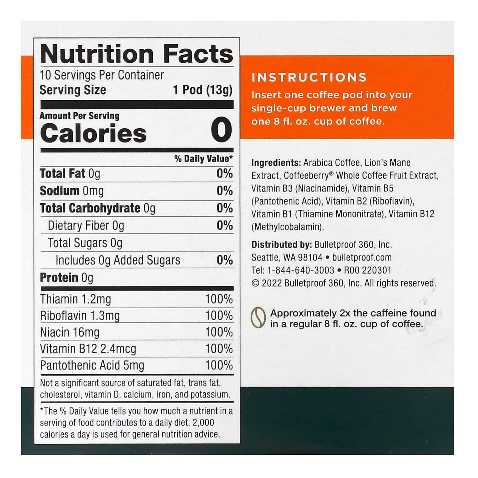 Arabica coffee, lion's mane extract, coffeeberry® whole coffee fruit extract, vitamin b3 (niacinamide), vitamin b5 (pantothenic acid), vitamin b2 (riboflavin), vitamin b1 (thiamine mononitrate), vitamin b12 (methylcobalamin).