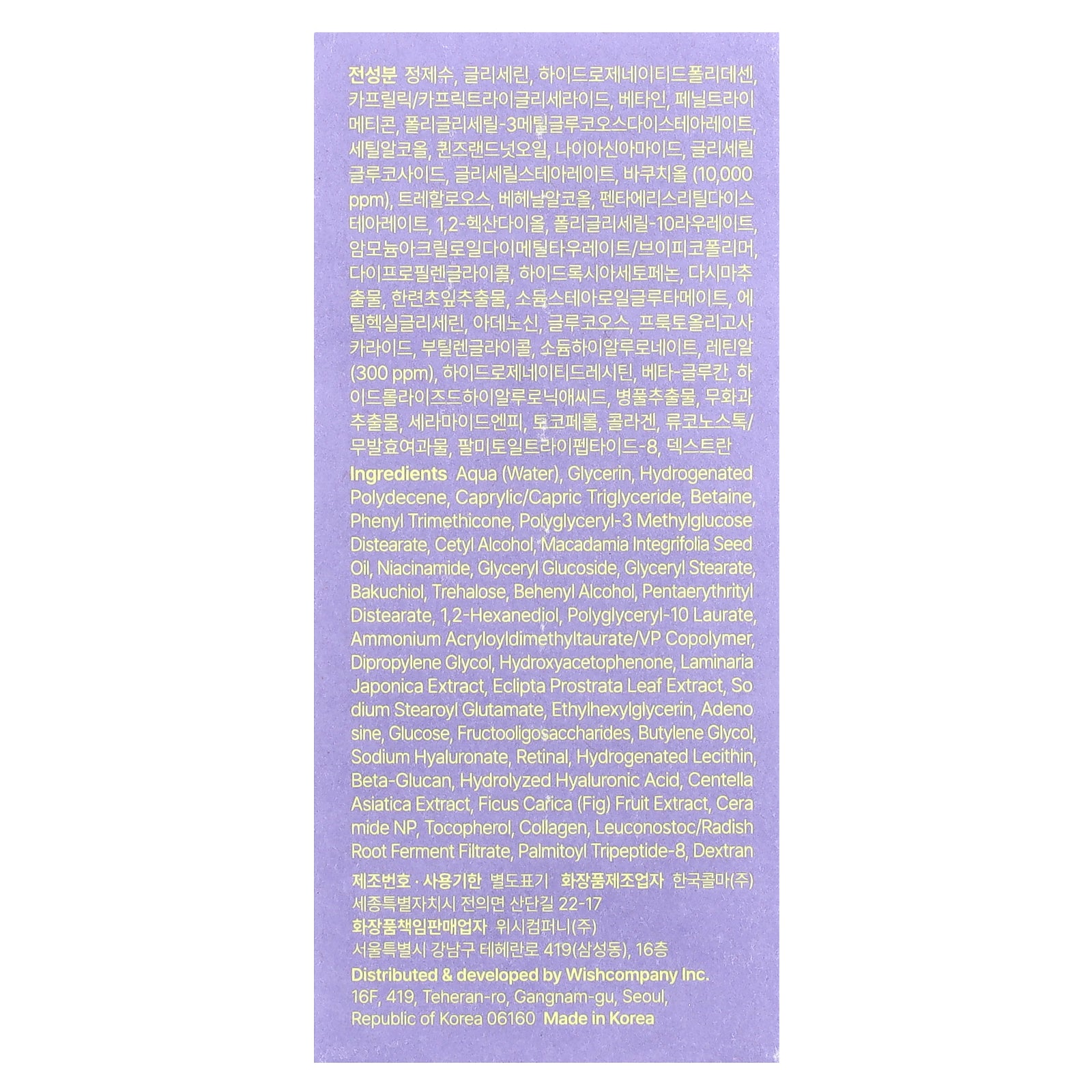 Aqua (water), glycerin, hydrogenated polydecene, caprylic/capric triglyceride, betaine, phenyl trimethicone, polyglyceryl-3 methylglucose distearate, cetyl alcohol, macadamia integrifolia seed oil, niacinamide, glyceryl glucoside, glyceryl stearate, bakuchiol, trehalose, behenyl alcohol, pentaerythrityl distearate, 1,2-hexanediol, polyglyceryl-10 laurate, ammonium acryloyldimethyltaurate/vp copolymer dipropylene glycol, hydroxyacetophenone, laminaria japonica extract, eclipta prostrata leaf extract, sodium stearoyl glutamate, ethylhexylglycerin, adenosine, glucose, fructooligosaccharides, butylene glycol, sodium hyaluronate, retinal, hydrogenated lecithin, beta-glucan, hydrolyzed hyaluronic acid, centella asiatica extract, ficus carica (fig) fruit extract, ceramide np, tocopherol, collagen, leuconostoc/radish root ferment filtrate, palmitoyl tripeptide-8, dextran.