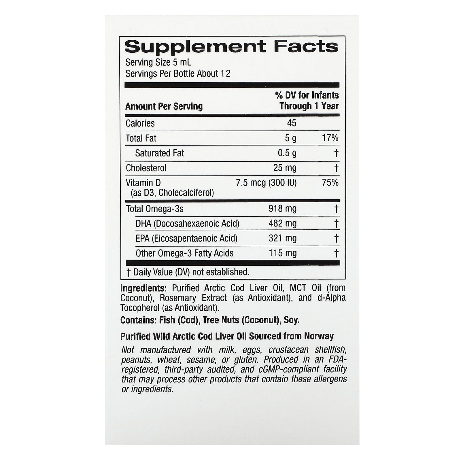 Purified Arctic Cod Liver Oil, MCT Oil (from Coconut), Rosemary Extract (as Antioxidant), and Non-GMO d-Alpha Tocopherol (as Antioxidant).