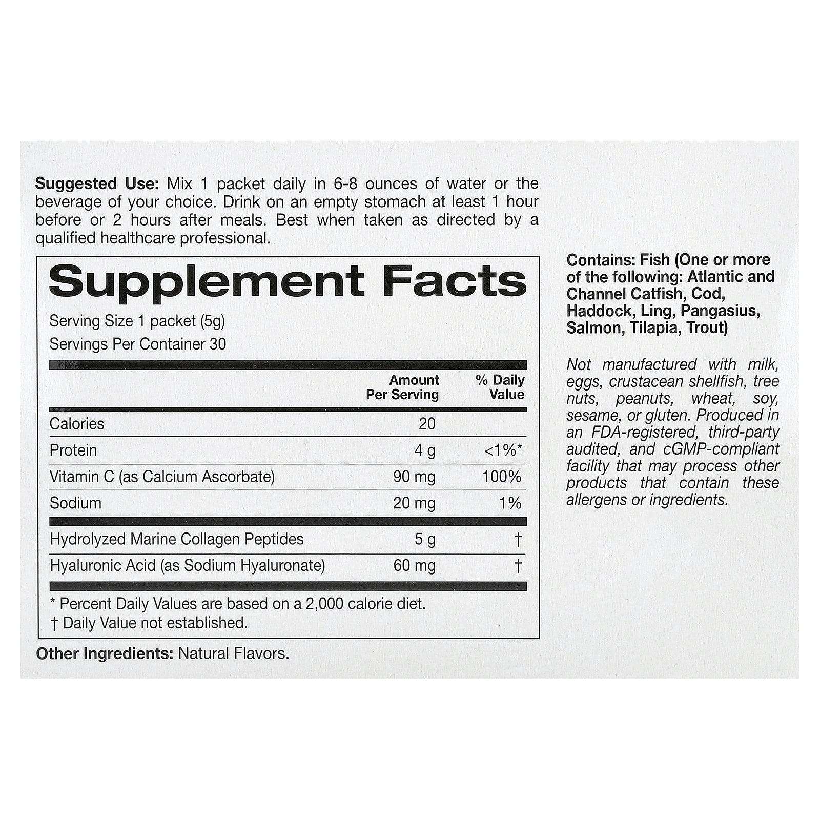 Vitamin C (as Calcium Ascorbate), Sodium, Hydrolyzed Marine Collagen Peptides, Hyaluronic Acid (as Sodium Hyaluronate)