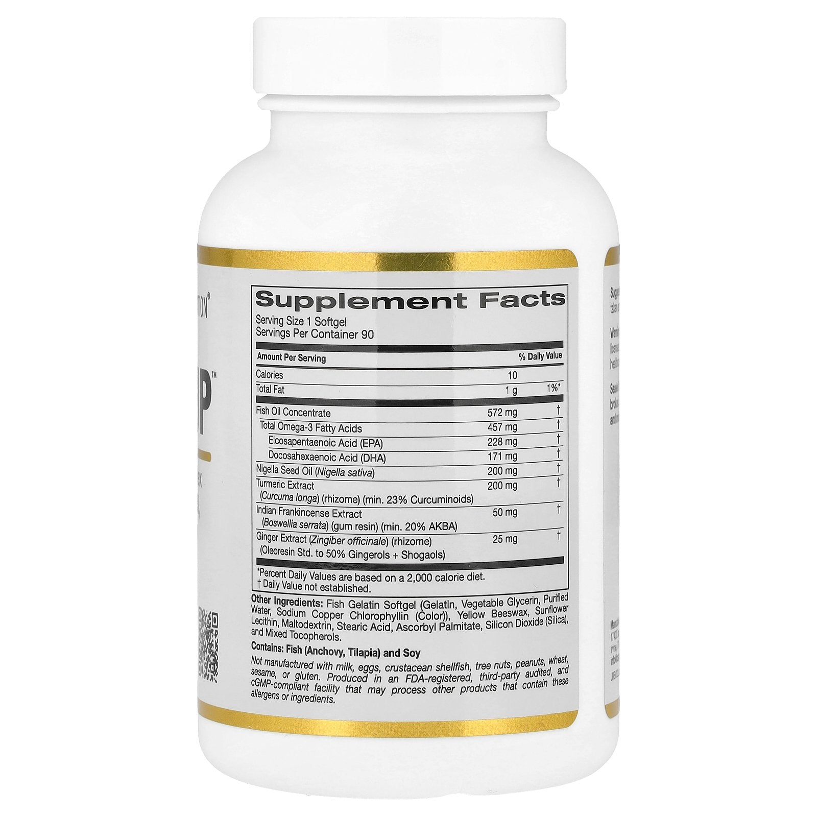 Fish Oil Concentrate, Nigella Seed Oil (Nigella sativa), Turmeric Extract (Curcuma longa) (rhizome) (min. 23% Curcuminoids), Indian Frankincense Extract (Boswellia serrata) (gum resin) (min. 20% AKBA), Ginger Extract (Zingiber officinale) (rhizome) (Oleoresin Std. to 50% Gingerols+Shogaols)