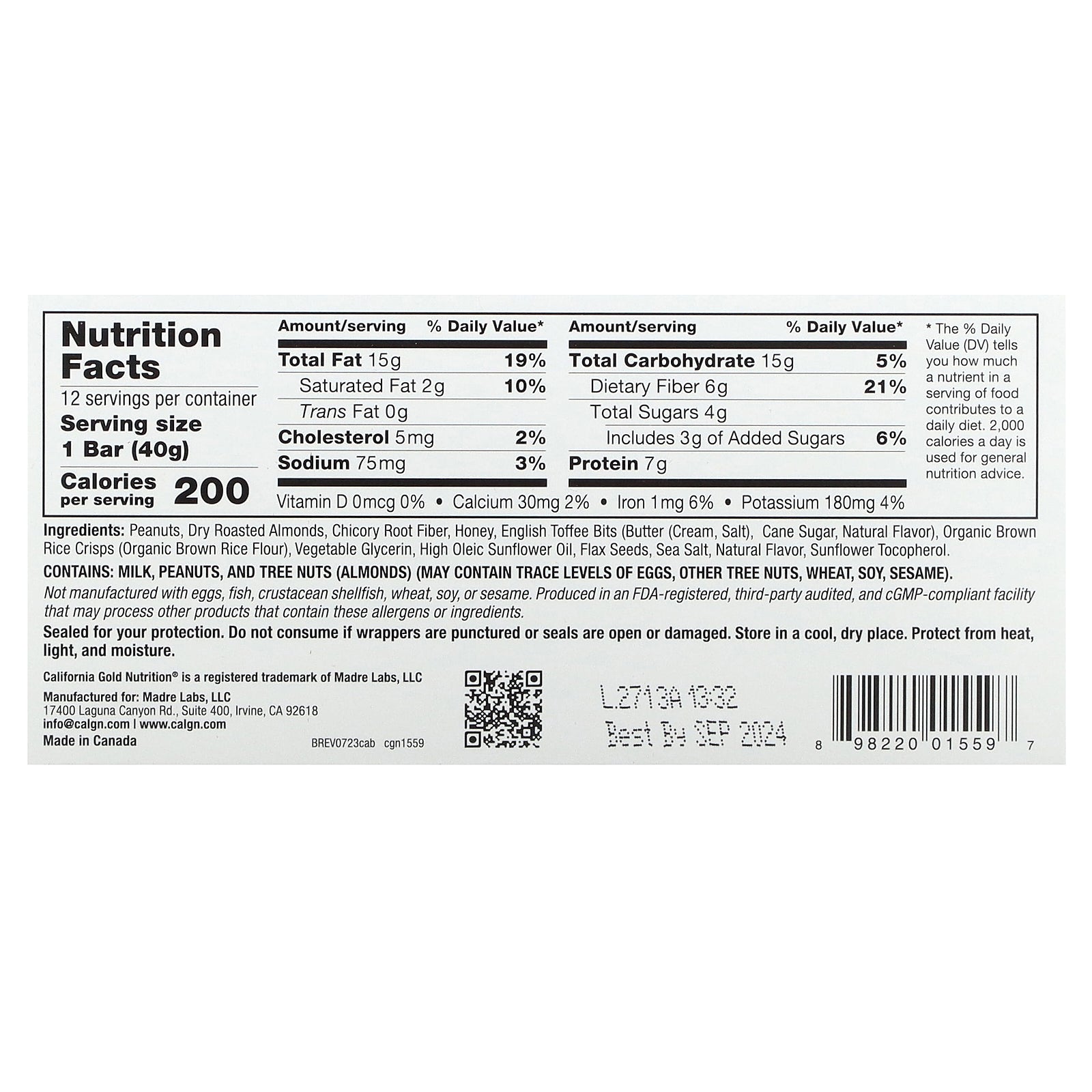 Peanuts, Dry Roasted Almonds, Chicory Root Fiber, Honey, English Toffee Bits (Butter (Cream, Salt), Cane Sugar, Natural Flavor), Organic Brown Rice Crisps (Organic Brown Rice Flour), Vegetable Glycerin, High Oleic Sunflower Oil, Flax Seeds, Sea Salt, Natural Flavor, Sunflower Tocopherol.