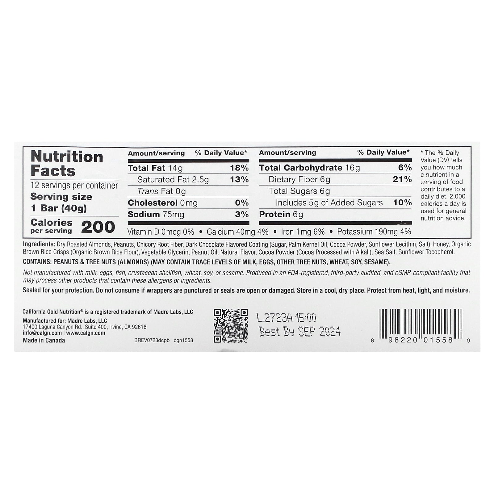 California Gold Nutrition Double Chocolate Peanut Butter Flavor Bars are made with simple ingredients, like roasted almonds, peanuts, dark chocolate, and honey, to create a nutritious and satisfying treat with plenty of fiber and protein. Each bar is individually wrapped, making them perfect for on-the-go snacking anytime, anywhere.