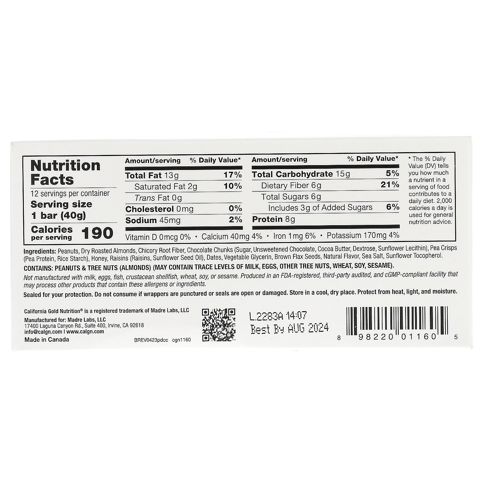 California Gold Nutrition® Foods Peanut & Dark Chocolate Chunk Snack Bars are made with premium chocolate and nuts to create a nutritious and satisfying treat with plenty of fiber and protein. Each bar is individually wrapped, making them perfect for on-the-go snacking anytime, anywhere.