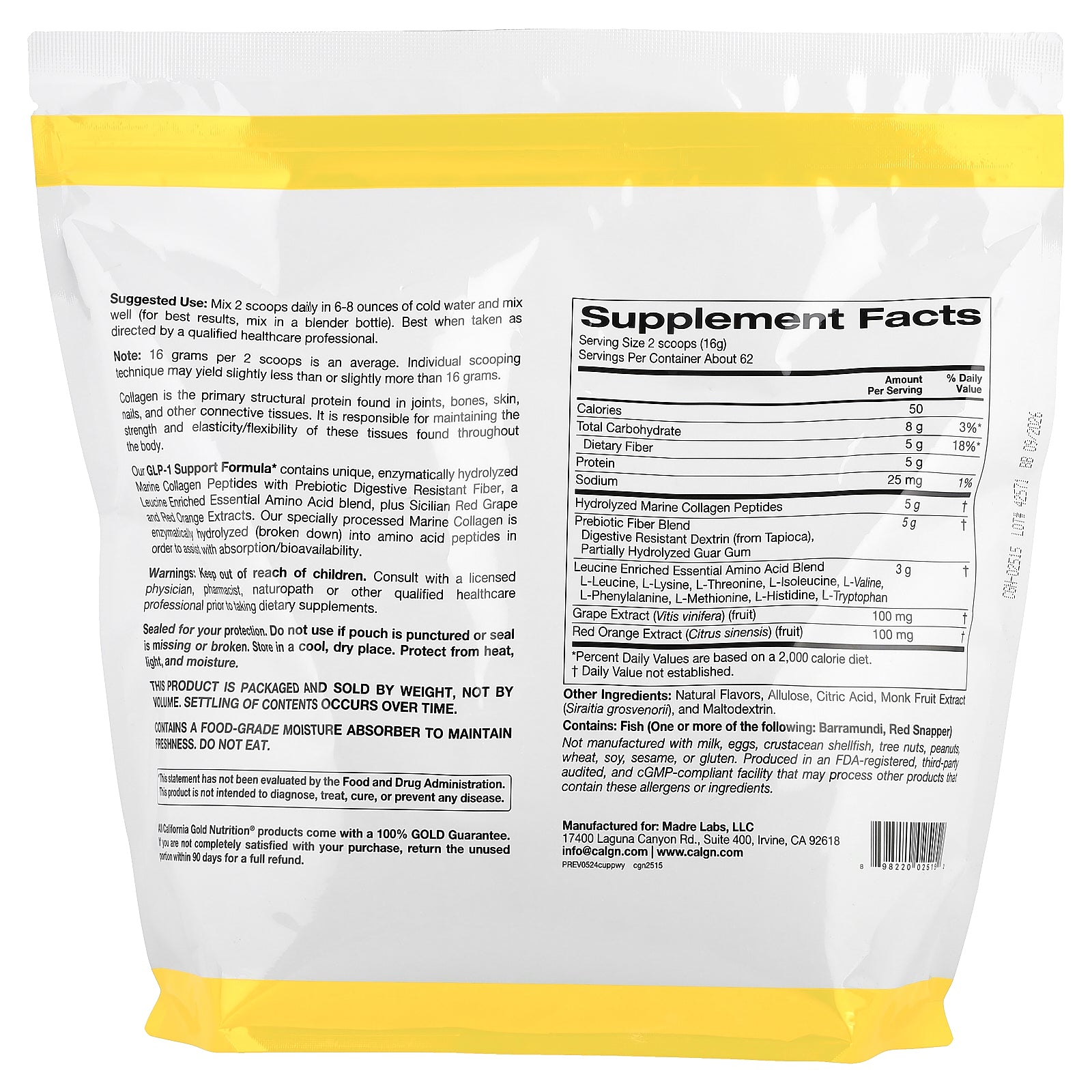 California Gold Nutrition® GLP-1 Support Formula* Watermelon Yuzu flavor contains unique, enzymatically hydrolyzed marine collagen peptides with prebiotic digestive resistant fiber, a leucine enriched essential amino acid blend, plus sicilian red grape and red orange extracts. Our specially processed marine collagen is enzymatically hydrolyzed (broken down) into amino acid peptides in order to assist with absorption/bioavailability.