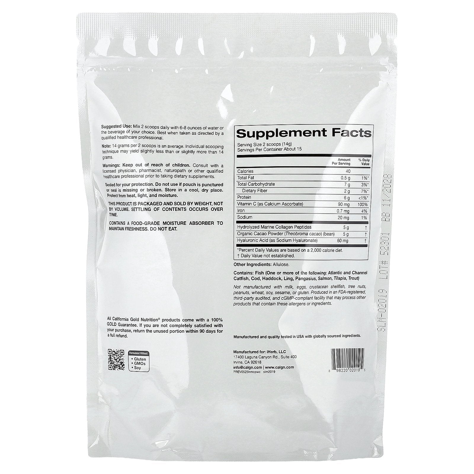 California Gold Nutrition® Hydrolyzed Marine Collagen Peptides with Cocoa can be mixed with water or the liquid of your choice to create a tasty drink that is a convenient source of collagen peptides.