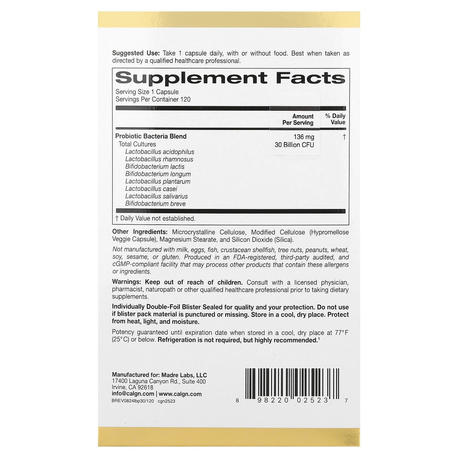 California Gold Nutrition® LactoBif® 30 Probiotics contain 8 active probiotic strains, including 5 Lactobacilli and 3 Bifidobacteria. It can help keep your gut balanced by introducing more good bacteria into your system, which can help promote digestive and immune health and potentially relieve common digestive symptoms.*