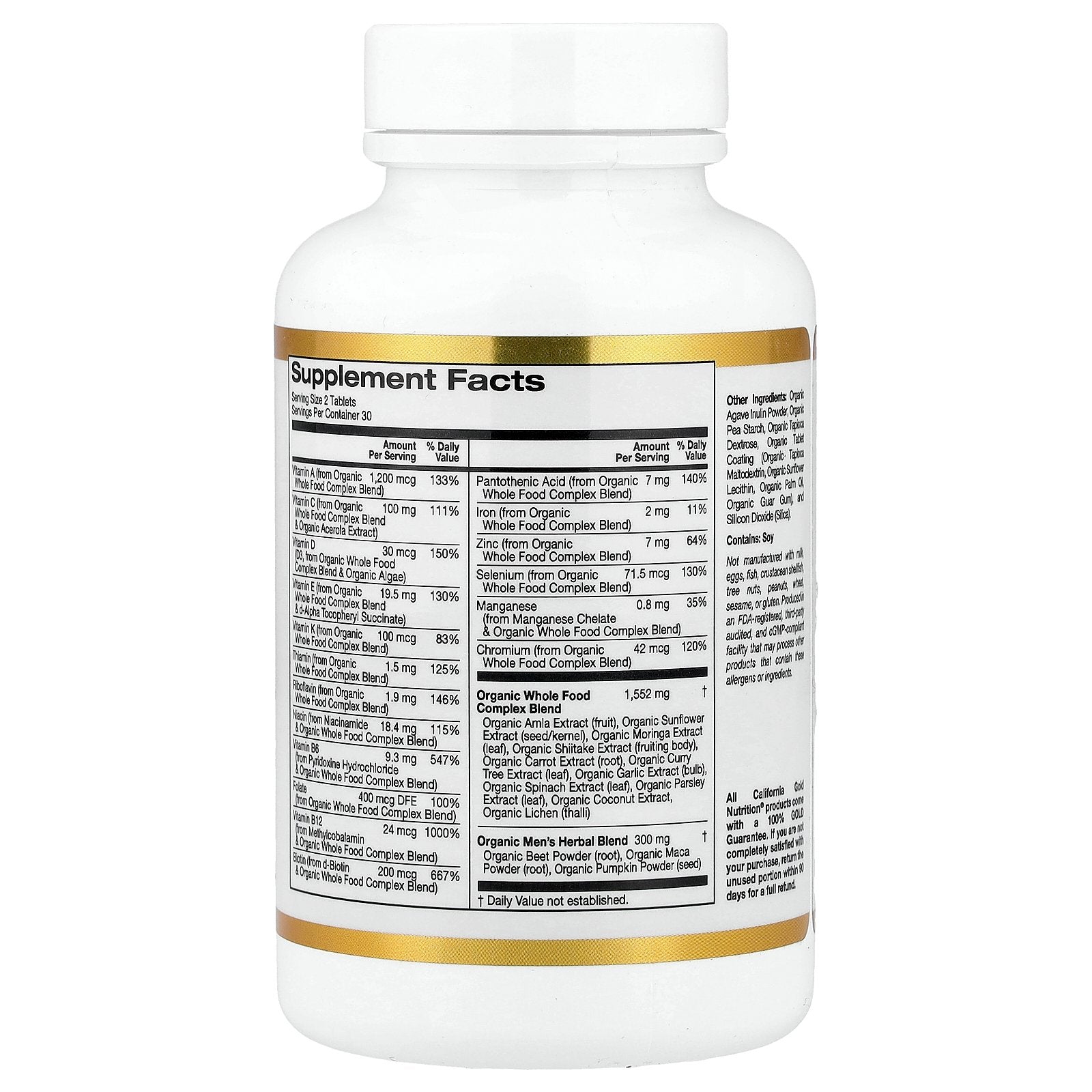 Vitamin A (from Organic Whole Food Complex Blend), Vitamin C (from Organic Whole Food Complex Blend & Organic Acerola Extract), Vitamin D3 (from Organic Whole Food Complex Blend & Organic Algae), Vitamin E (from Organic Whole Food Complex Blend & as d-alpha Tocopheryl Succinate), Vitamin K (from Organic Whole Food Complex Blend), Thiamine (from Organic Whole Food Complex Blend), Riboflavin (from Organic Whole Food Complex Blend), Niacin (as Niacinamide & from Organic Whole Food Complex Blend), Vitamin B6 (as Pyridoxine Hydrochloride & from Organic Whole Food Complex Blend), Folate (from Organic Whole Food Complex Blend), Vitamin B12 (as Methylcobalamin & from Organic Whole Food Complex Blend), Biotin (from d-Biotin and from Organic Whole Food Complex Blend), Pantothenic Acid (from Organic Whole Food Complex Blend), Iron (from Organic Whole Food Complex Blend), Zinc (from Organic Whole Food Complex Blend), Selenium (from Organic Whole Food Complex Blend), Manganese (from Manganese Chelate & Organic Whole Food Complex Blend), Chromium (from Organic Whole Food Complex Blend), Organic Whole Food Complex Blend: Organic Amla Extract (fruit), Organic Sunflower Extract (seed/kernel), Organic Moringa Extract (leaf), Organic Shiitake Extract (fruiting body), Organic Carrot Extract (root), Organic Curry Tree Extract (leaf), Organic Garlic Extract (bulb), Organic Spinach Extract (leaf), Organic Parsley Extract (leaf), Organic Coconut Extract, Organic Lichen (thalli). Organic Men's Herbal Blend: Organic Beet Powder (root), Organic Maca Powder (root), Organic Pumpkin Powder (seed).