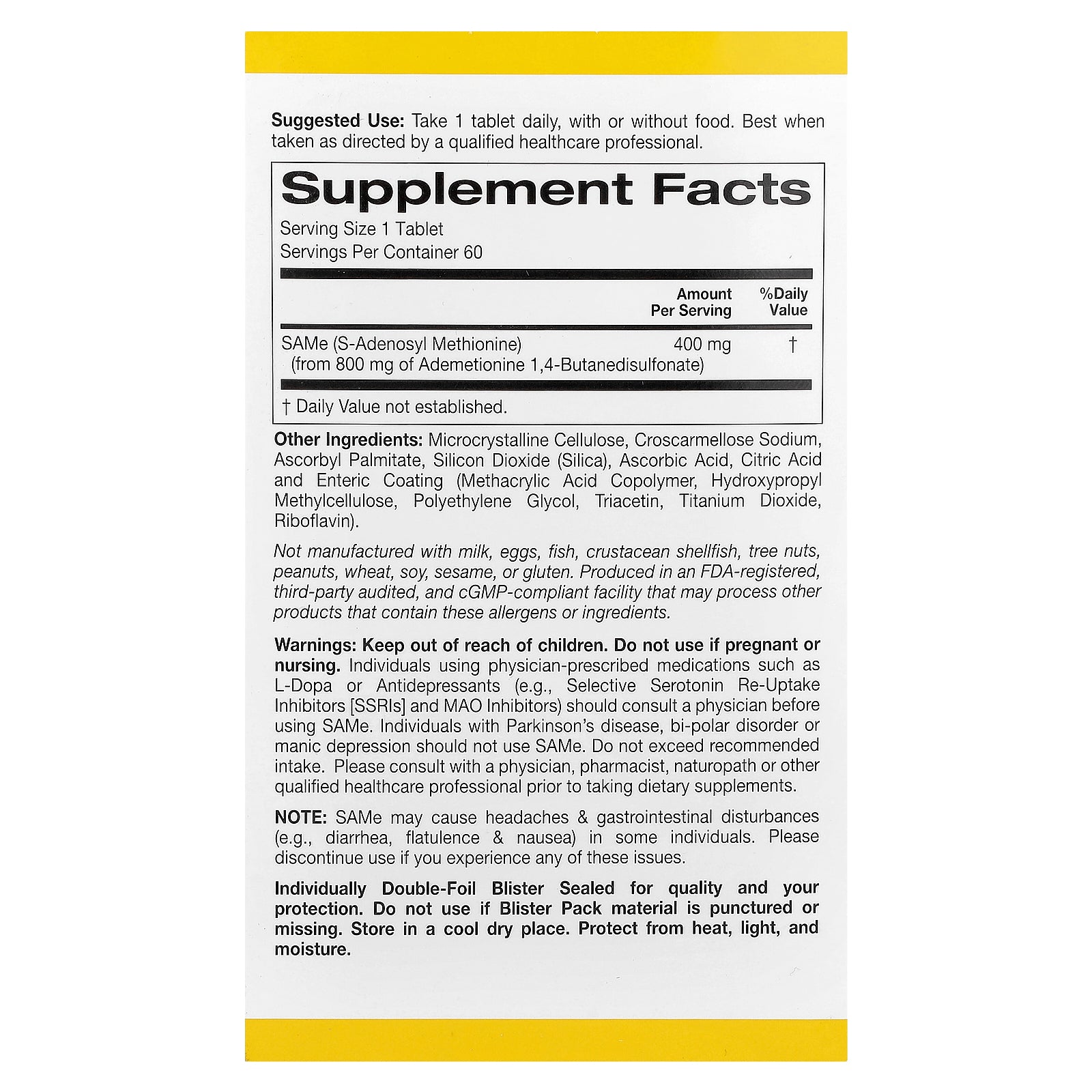 Keep out of the reach of children. Do not use if pregnant or nursing. Individuals using physician-prescribed medications such as L-Dopa or Antidepressants (e.g., Selective Serotonin Re-Uptake Inhibitors [SSRIs] and MAO Inhibitors) should consult a physician before using SAMe. Individuals with Parkinson’s disease, bi-polar disorder or manic depression should not use SAMe. Do not exceed recommended intake. Please consult with a physician, pharmacist, naturopath or other qualified healthcare professional prior to taking dietary supplements.